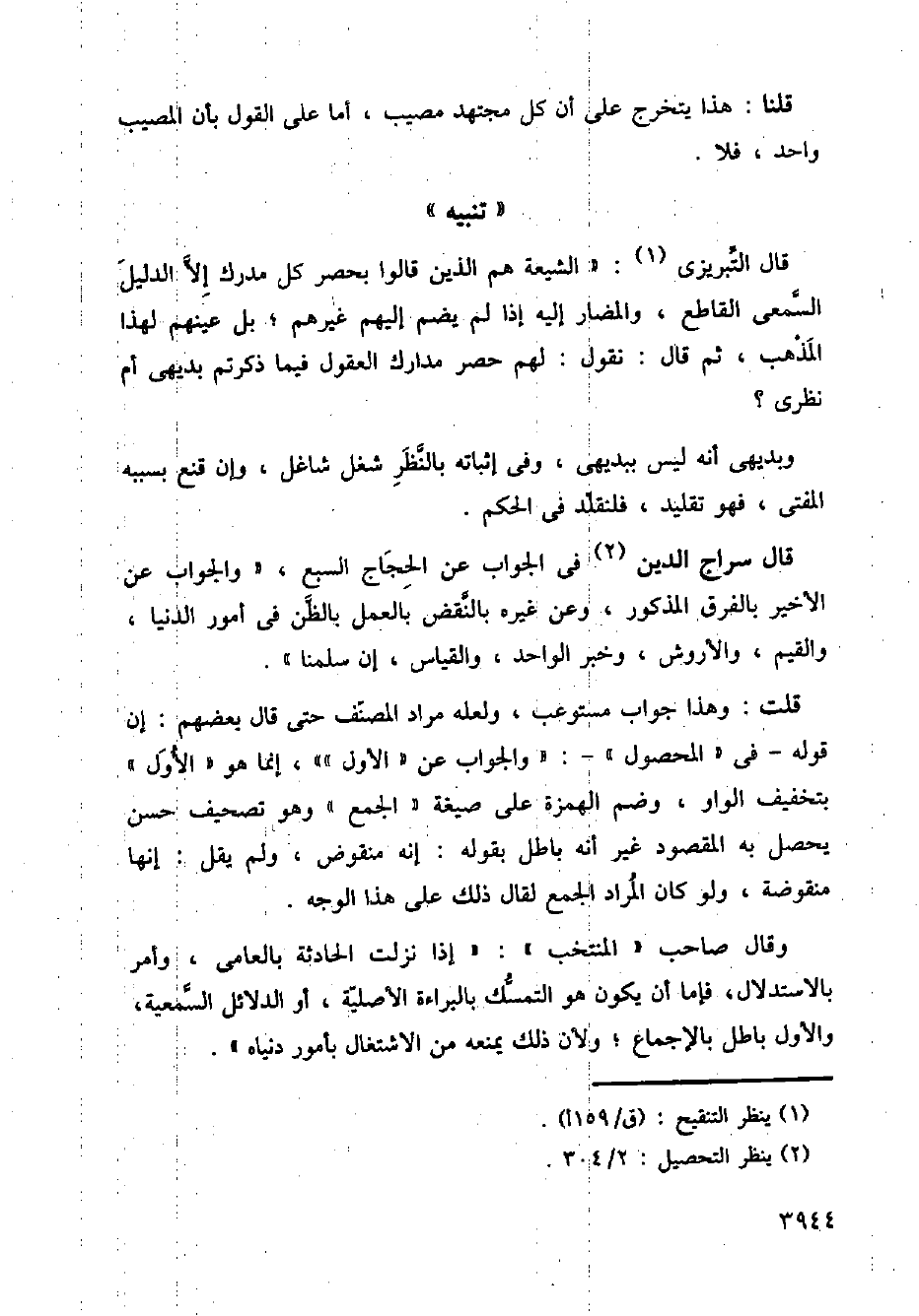 قال سراج الدين في الجواب عن الحجاج السبع، (والجواب عن الأخير بالفرق المذكور، وعن غيره بالنقض بالعمل بالظن في أمور الدنيا، والقيم، والأروش، وخبر الواحد، والقياس، إن سلمنا).