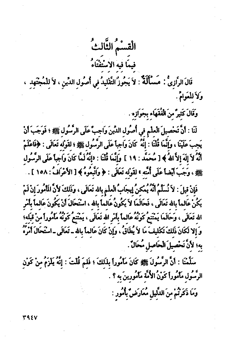 قال الرازي: مسألة: لا يجوز التقليد في أصول الدين، لا للمجتهد، ولا للعوام.