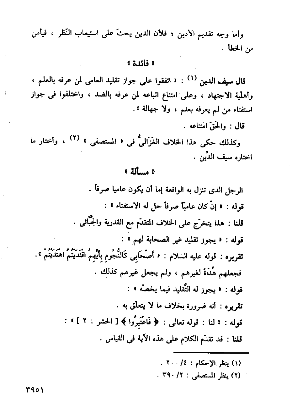 قال سيف الدين: (اتفقوا على جواز تقليد العامي لمن عرفه بالعلم، وأهلية الاجتهاد، وعلى امتناع اتباعه لمن عرفه بالضد، واختلفوا في جواز استفتاء من لم يعرفه بعلم، ولا جهالة).