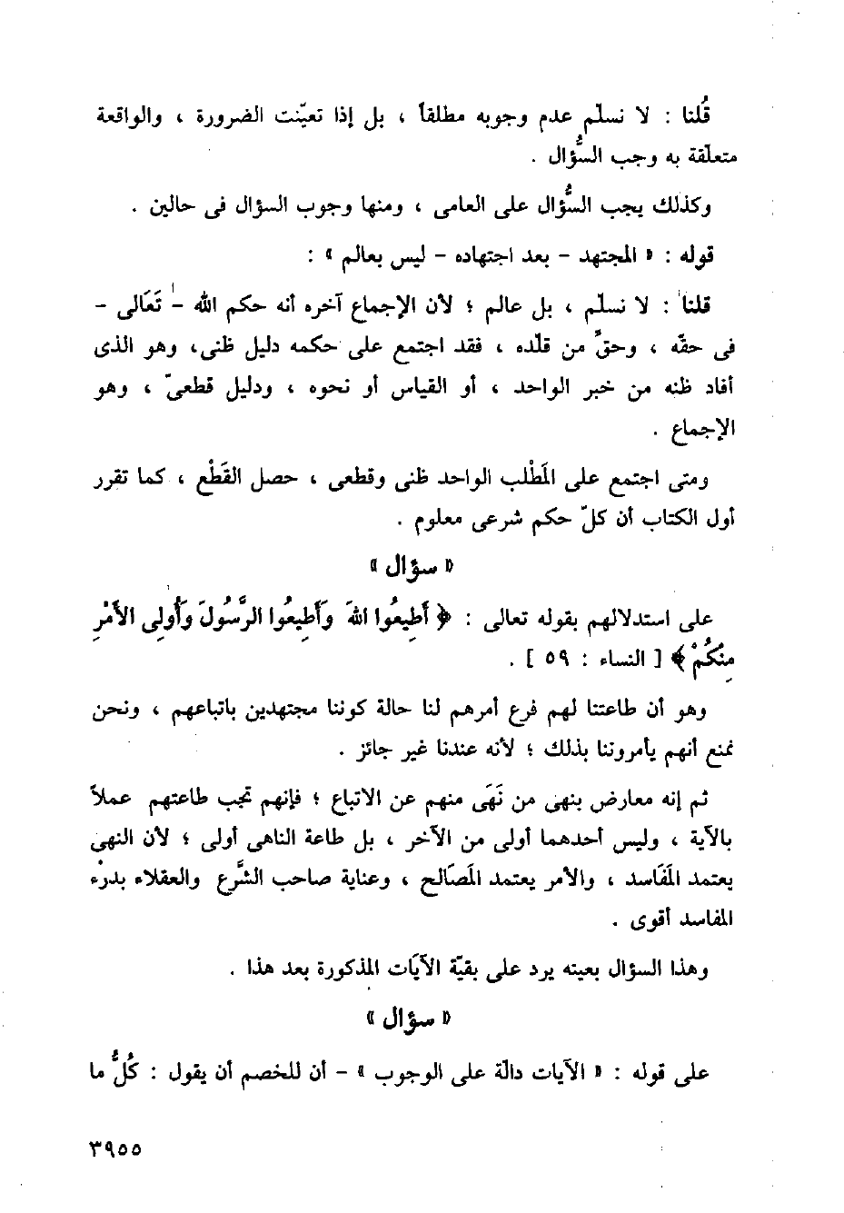 قلنا: لا نسلم عدم وجوبه مطلقًا، بل إذا تعينت الضرورة، والواقعة متعلقا به وجب السؤال.