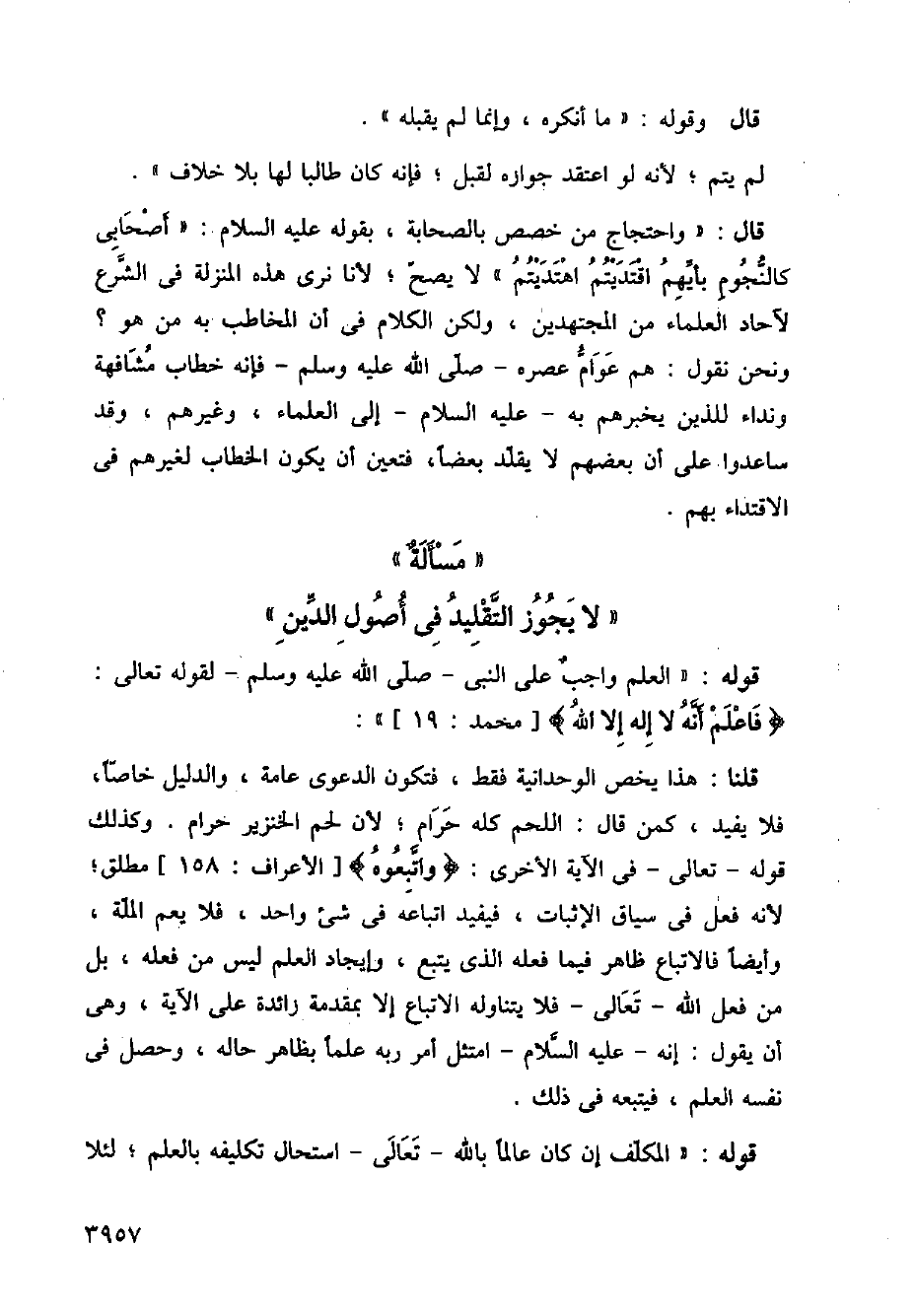 قلنا: هذا يخص الوحدانية فقط، فتكون الدعوى عامة، والدليل خاصًا، فلا يفيد، كم قال: اللحم كله حرام؛ لأن لحم الخنزير حرام. وكذلك قوله -تعالى -في الآية الأخرى: {واتبعوه} [الأعراف: 158] مطلق؛ لأنه فعل في سياق الإثبات، فيفيد اتباعه في شيء واحد، فلا يعم الملة، وأيضًا فالإتباع ظاهر فيما فعله الذي يتبع، وإيجاد العلم ليس من فعله، بل من فعل الله -تعالى -فلا يتناوله الإتباع إلا بمقدمة زائدة على الآية، وهى أن يقول: إنه -عليه السلام -امتثل أمر ربه علمًا بظاهر حاله، وحصل في نفسه العلم، فيتبعه في ذلك.