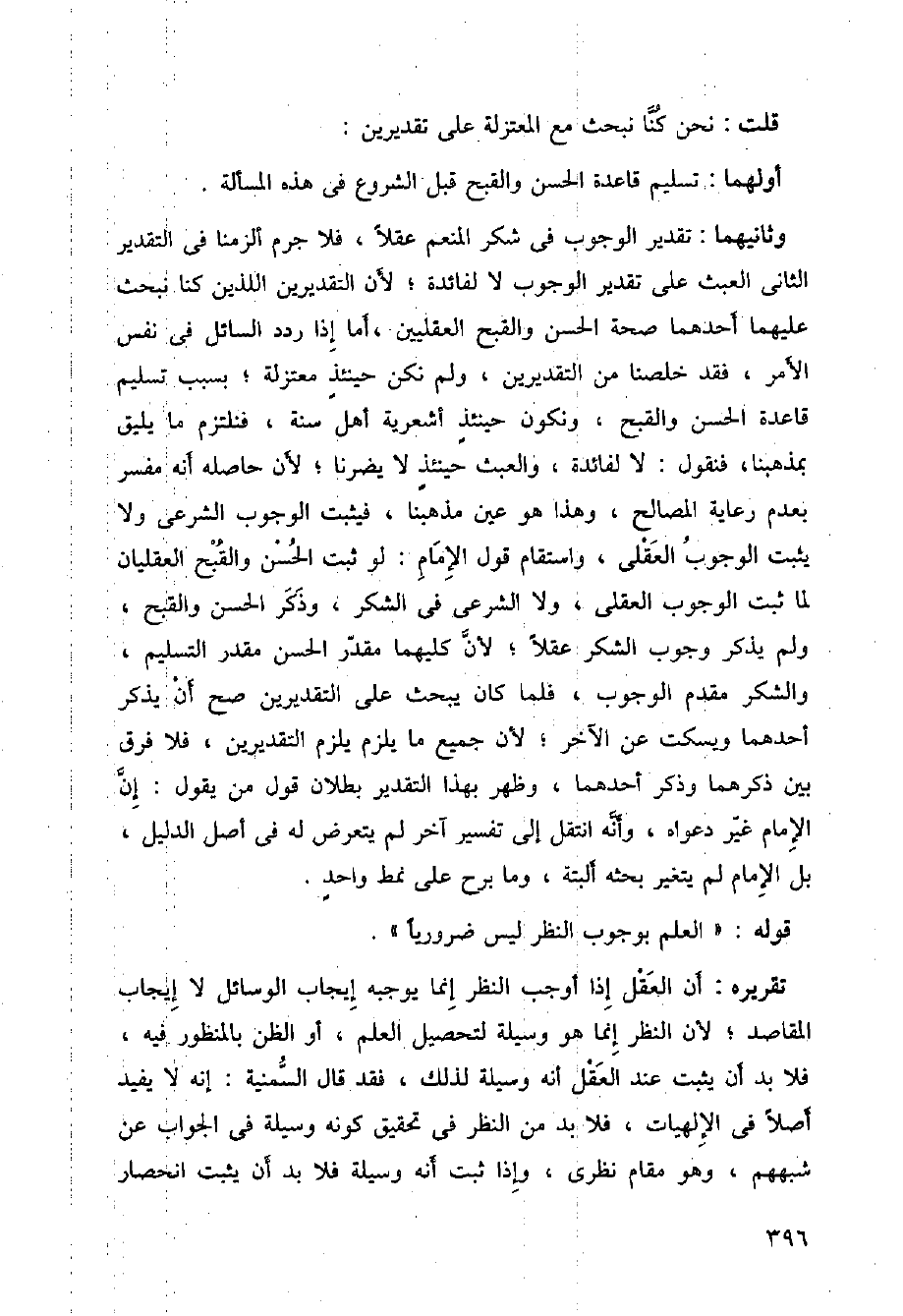 وثاثنهما: تقدير الوجوب في شكر المنعم عقلا، فلا جزم ألزمنا في التقدير الثاني العبث على تقدير الوجوب لا لفائده، لأن التقديرين اللذين كنا نبحث عليهما أحدهما مصحة الحسن والقبح العقليين، أما إذا ردد السائل في نفس الأمر، فقد خلصنا عمن التقديرين، ولمن نكن حينئذ معتزلة، بسبب تسليم قاعدة الحسن والقبح، ونكون حينئذ اشعرية أهل سنة، لأن حاصله أنه مفسر بعدم رعاية المصالح، وهذا هو عين مذهبنا، فيثبت الوجوب الشرعي ولا يثبت الوجوب العقلي، واستقام قول الإمام: لو ثبت الحسن والقبح العقليان لما ثبت الوجوب العقلي، ولا الشرعي في الشكر، وذكر الحسن والقبح، ولم يذكر وجوب الشكر عقلا، لأن كليهما مقدر الحسن مقدر التسليم، والشرك مقدم الوجوب، فلما كان يحبث على التقديرين صح ان يذكر أحدهما وسكت عن الآخر؛ لان جميع ما يلزم يلزم التقديرين، فلا فرق بين ذكرهما وذكر أحدهما، وظهر بهذا التقدير بطلان قول من يقول: إن الإمام غير دعواه، وأنه انتقل إلى تفسر آخر لم يتعرض له في أصل الديل، بل الإمام لم يتغير بحث ألبتة، وما برح على نمط واحد.
