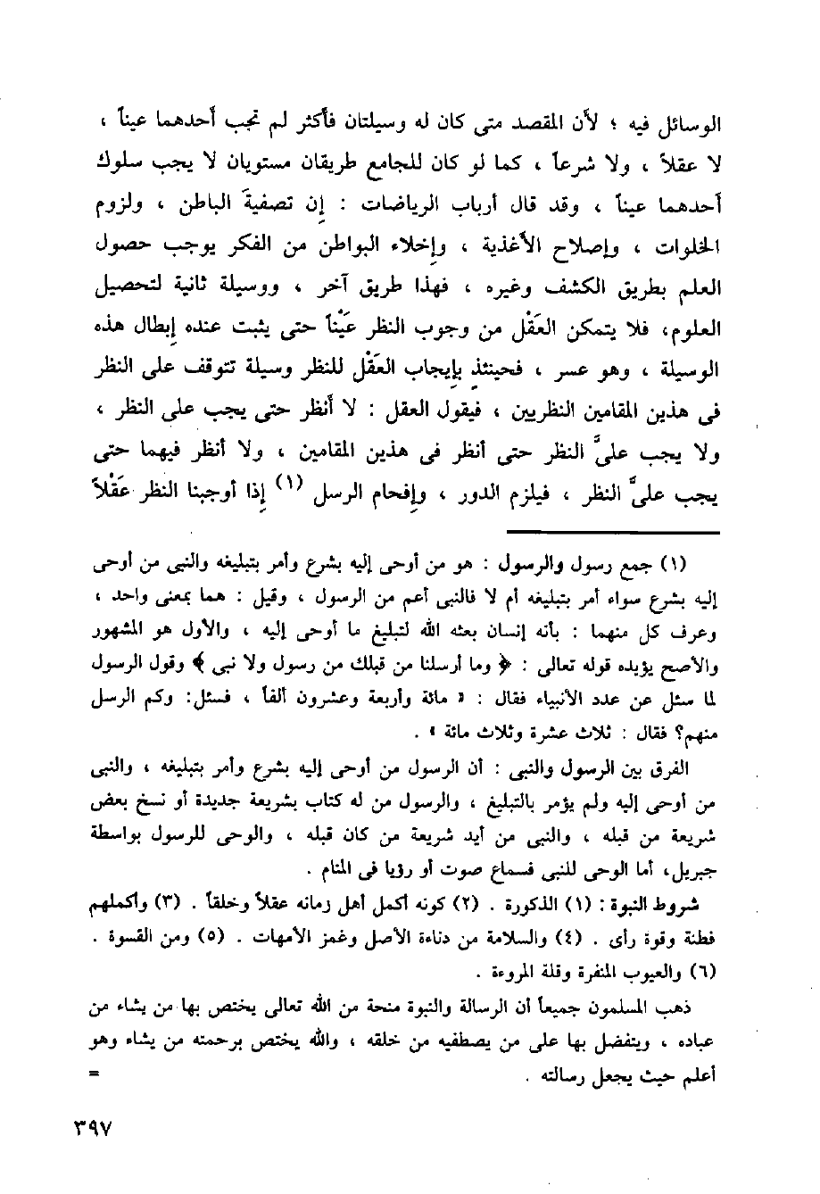 الوسائل فيه، لا، المقصد متى كان له وسيلتان فأكثر لم تجب أحدهما عينا، لا عقلا ولا شرعا، كما لو كان للجامع طريقان مستويان لا جيب سلوك أحدهما عينا وقد قال أرباب الرياضيات: إن تصفية الباطن، لزوم الخلوات وإصلاح الأغذية وإخلاء البواطن من الفكر يوجب حصول العلم بطريق الشطح وغيره، فهذا طريق آخر، ووسيلة ثانية لتحصيل العلوم، فلا يتمكن العقل من وجوب النظر عينا حتى يثبت عنده إبطال هذه الوسيلة، وهو عسر، فحينئذ بإيجب العقل للنظر وسيلة تتوقف على أنظر في هذين المقامين النظريين، فيقول العقل: لا أنظر حتى يجب علي النظر، ولا يجب علي النظر حتى أنظر في هذين المقامين، ولا أنظر فيهما حتى يجب علي النظر فيلزما لدور، وإقحام الرسل إذا أوجبنا النظر عقلا