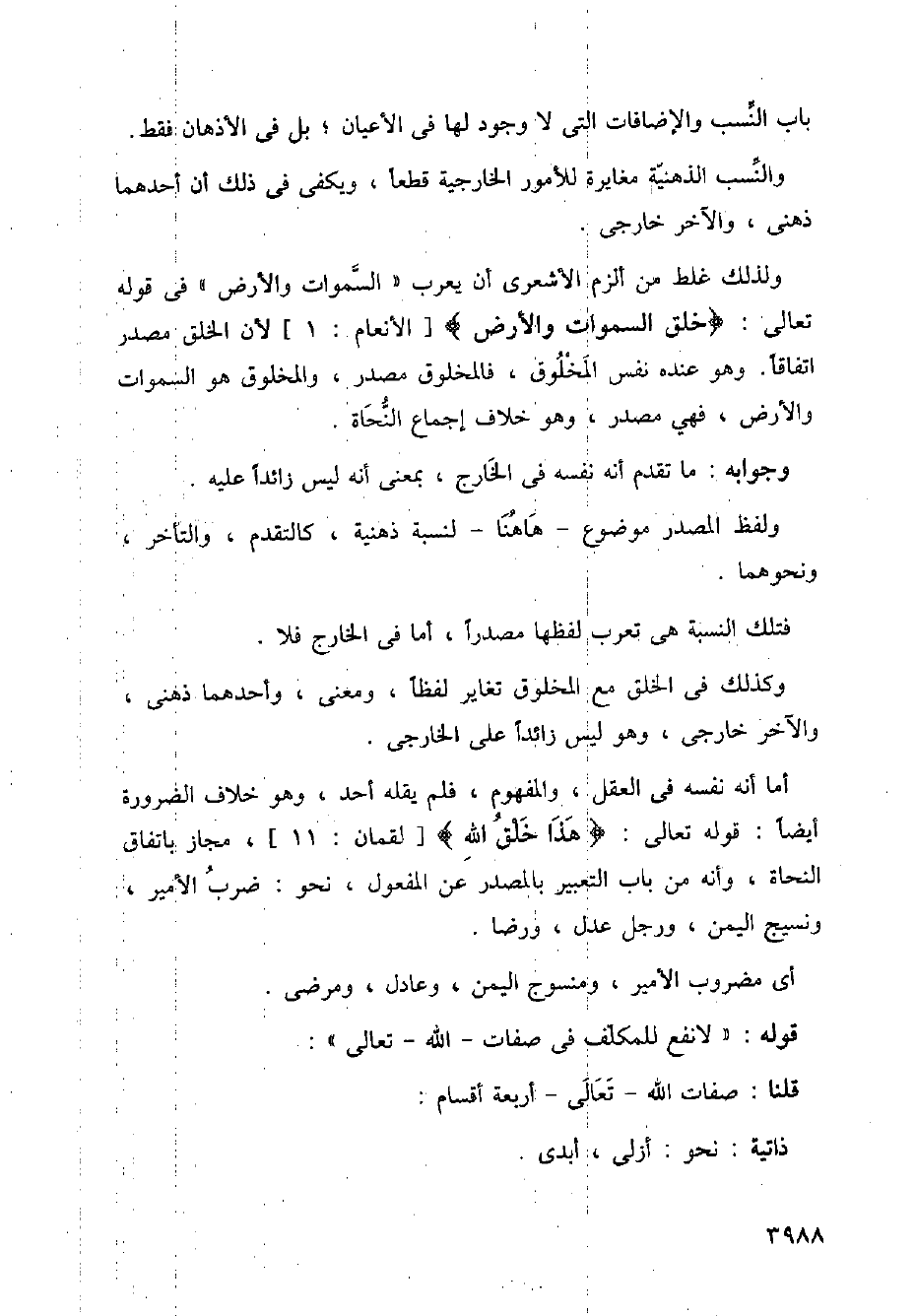 ولذلك غلط من ألزم الأشعري أنت يعرب (السموات والأرض) في قوله تعالى: {خلق السموات والأرض} [الأنعام: 1] لأن الخلق مصدر اتفاقًا. وهو عنده نفس المخلوق، فالمخلوق مصدر، والمخلوق هو السموات والأرض، فهي مصدر، وهو خلاف إجماع النحاة.
