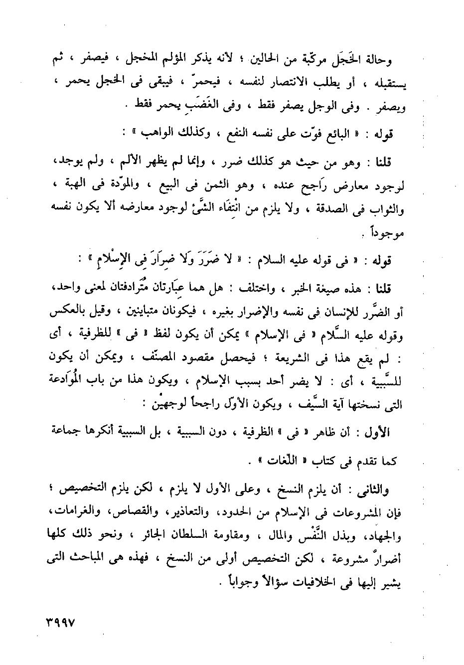 والثاني: أن يلزم النسخ، وعلى الأول لا يلزم، لكن يلزم التخصيص؛ فإن المشروعات في الإسلام من الحدود، والتعاذير، والقصاص، والغرامات، والجاد، وبذل النفس والمال، ومقاومة السلطان الجائر، ونحو ذلك كلها أضرار مشروعة، لكن التخصيص أولى من النسخ، فهذه ى المباحث التي يشير إليها في الخلافيات سؤالاً وجواباً.