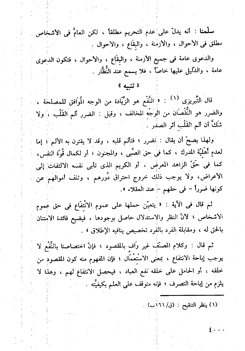 ثم قال: وكلام المصنف غير واف بالمقصود؛ فإن اختصاصنا بالنفع لا يوجب إباحة الانتفاع، بمعنى الاستعمال؛ فإن المفهوم منه كون المقصود من خلقه، أو الحامل على خلقه نفع العباد، فيحصل الانتفاع لهم، وهذا لا يلزم من إباحة التصرف؛ فإنه متوقف على العلم بكيفيته.