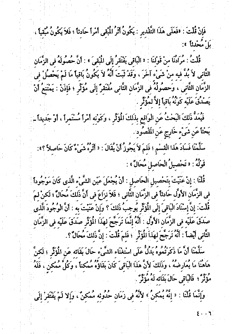 قلنا: إن عنيت بتحصيل الحاصل: أن يجعل عين الشيء الذي كان موجودًا في الزمان الأول حادثًا في الزمان الثاني؛ فلا نزاع في أن ذلك محال؛ لكن لم قلت: إن إسناد الباقي إلى المؤثر يوجب ذلك؟ وإن عنيت به: أن الوجود الذي صدق عليه في الزمان الأول: أنه إنما ترجح لهذا المؤثر صدق عليه في الزمان الثاني أيضًا: أنه ترجح لهذا المؤثر؛ فلم قلت: إن ذلك محال؟.