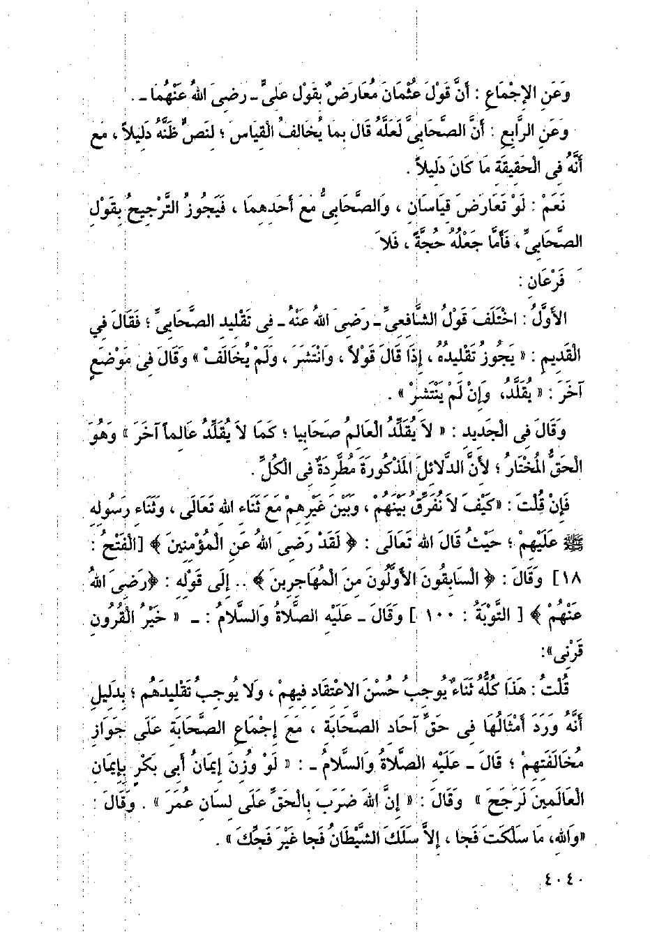 وقال في الجديد: (لا يقلد العالم صحابيا؛ كما لا يقلد عالمًا آخر) وهو الحق المختار؛ لأن الدلائل المذكورة مطردة في الكل.