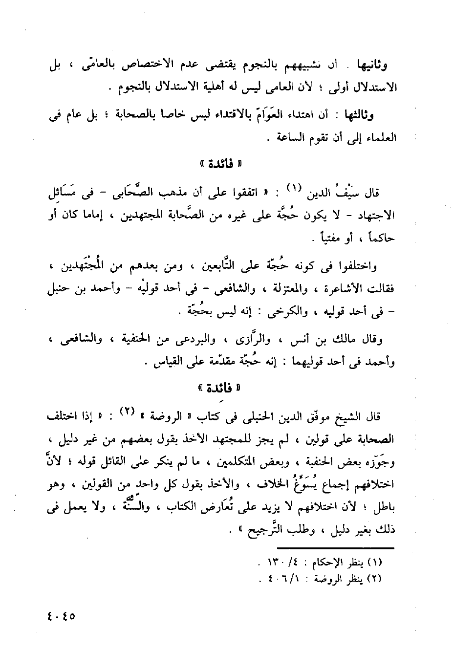 قال سيف الدين: (اتفقوا على أن مذهب الصحابي -في مسائل الاجتهاد -لا يكون حجة على غيره من الصحابة المجتهدين، إماما كان أو حاكمًا، أو مفتيًا.