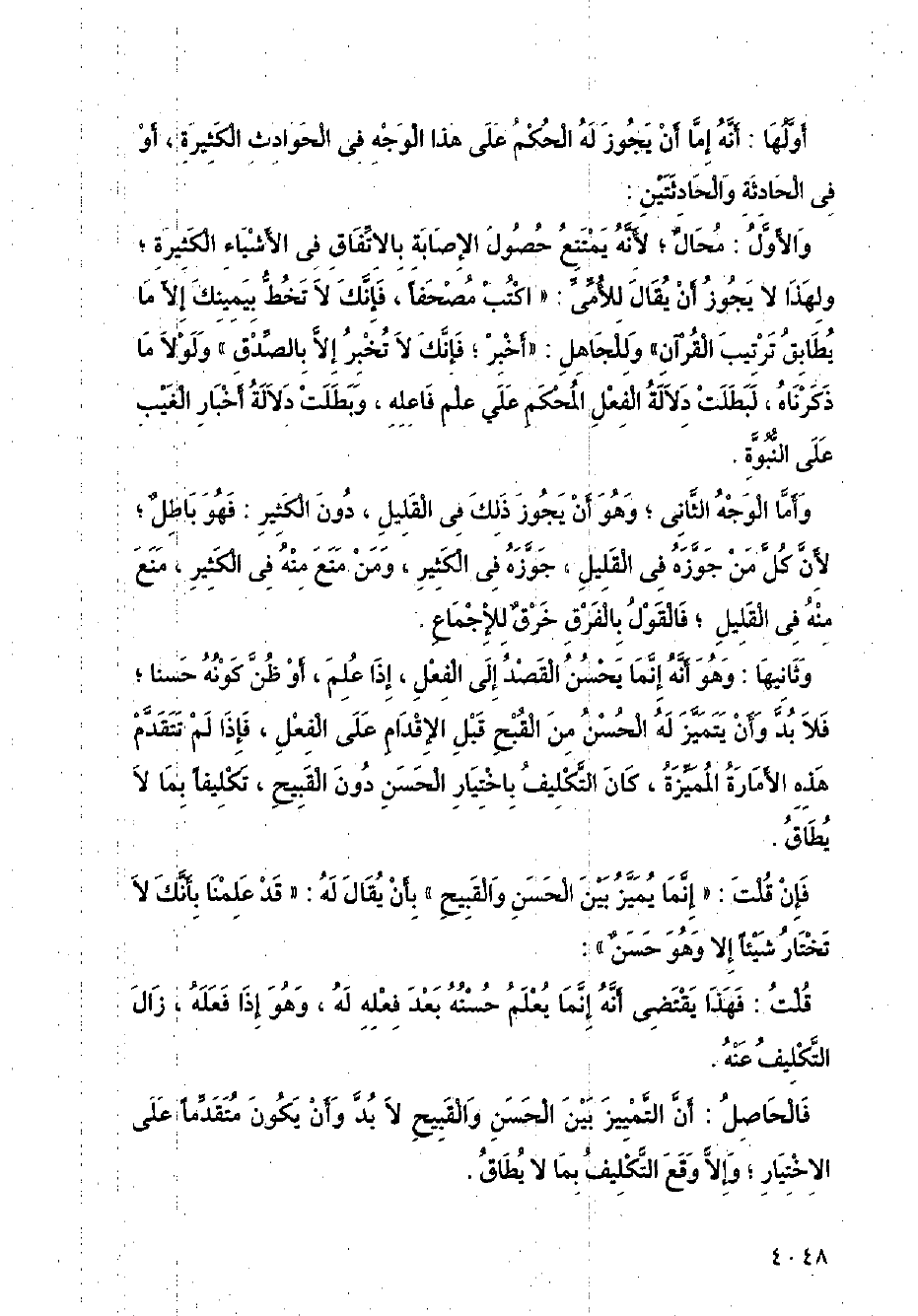 وثانيها: وهو أنه إنما يحسن القصد إلى الفعل، إذا علم، أو ظن كونه حسنا؛ فلابد وأن يتميز له الحسن من القبح قبل الإقدام على الفعل، فإذا لم تتقدم هذه الأمارة المميزة، كان التكليف باختيار الحسن دون القبيح، تكليفًا بما لا يطاق.