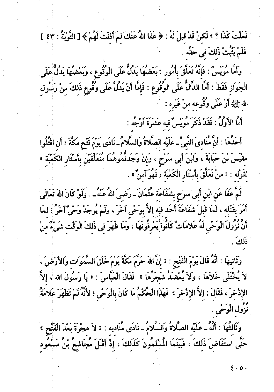 وثانيها: أنه قام يوم الفتح: (إن الله حرم مكة يوم خلق السموات والأرض، لا يختلي خلاها، ولا يعضد شجرها) فقال العباس: (يا رسول الله، إلا الإذخر، فقال: إلا الإذخر) فهذا الحكم ما كان بالوحي؛ لأنه لم تظهر علامة نزول الوحي.
