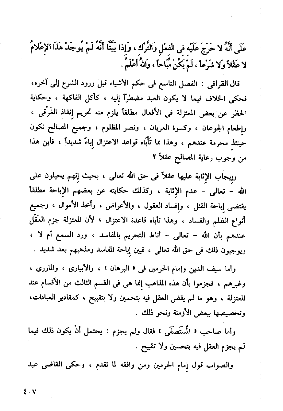 قال القرافي: الفصل التاسع في حكم الأشياء قبل ورود الشرع إلى آخره، فحكى الخلاف فيما لا يكون العبد مضطرا إليه، كأكل الفاكهة، وحكاية الحظر عن بعض المعتزلة في الأفعال مطلقا يلزم منه تحريم إنقاذ الغرقى، وإطعام الجوعان، وكسوة العريان، ونصر المظلوم، وجميع المصالح تكون حينئذ محرمة عندهم، وهذا مما تأباه قواعد الاعتزال إباء شديدا، فأين هذا من وجوب رعاية المصالح عقلا؟