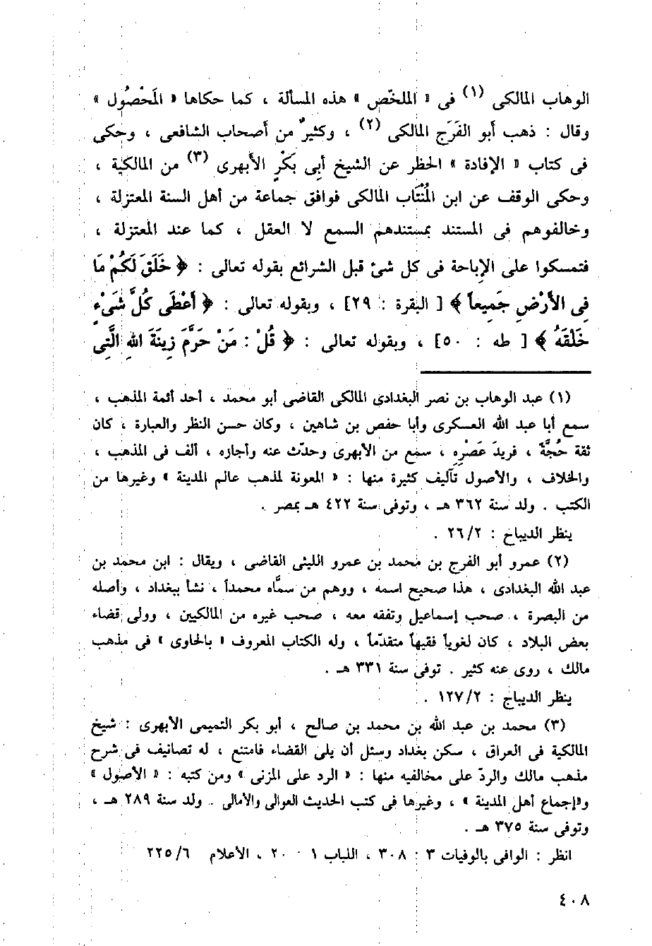 الوهاب المالكي في ((الملخص)) هذ المسألة، كما حكاها "المحصول" وقال: ذهب أبوالفرج المالكي وكثر من أصحاب الشافعي وحكى في كتاب "الإفادة" الحظر عن الشيخ أبي بكر الأبهري من الماليكة، وحكي الوقف عن ابن المنتاب المالكي فوافق جماعة من أهل السنة المعتزلة، وخالفوهم في المستند بمستندهم السمع لا العقل، كما عند المعتزلة، فتمسكوا على الإباحة في كل شيء قبل الشرائع بقوله تعالى: ((خلق لكم ما في الأرض جميعا))، وبقوله تعالى: "أعطى كل شيء خلقه " وبقوله تعالى: "قل: من حرم زينة الله التي