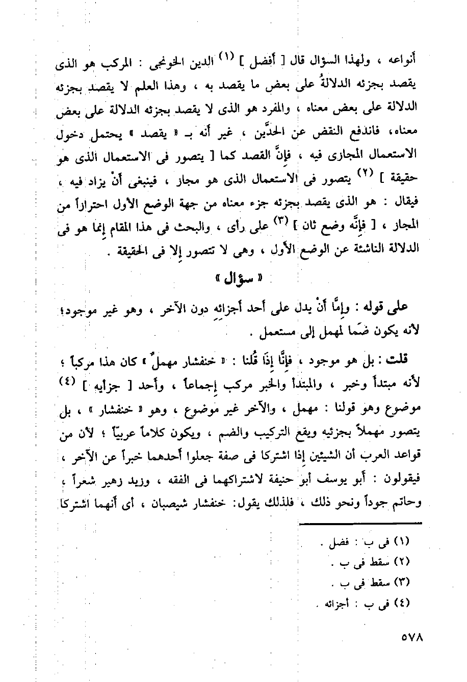 أنواعه، ولهذا السؤال قال] أفضل [الدين الخونجى: المركب هو الذي يقصد بجزئه الدلالة على بعض ما يقصد به، وهذا العلم لا يقصد بجزئه الدلالة على بعض معناه، والمفرد هو الذي لا يقصد بجزئه الدلالة على بعض معناه، فاندفع النقض عن الحدين، غير أنه بـ (يقصد) يحتمل دخول الاستعمال المجازى فيه، فإن القصد كما] يتصور في الاستعمال الذي هو حقيقة [يتصور في الاستعمال الذي هو مجاز، فينبغي أن يزاد فيه، فيقال: هو الذي يقصد بجزئه جزء معناه من جهة الوضع الأول احترازا من المجاز،] فإنه وضع ثان [على رأي، والبحث في هذا المقام إنما هو في الدلالة الناشئ عن الوضع الأول، وهى لا تتصور إلا في الحقيقة.