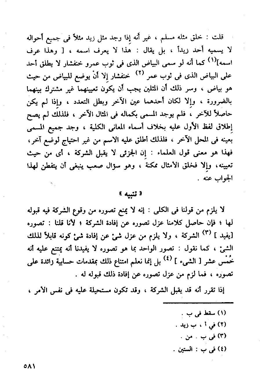 قلت: خلق مثله مسلم، غير أنه إذا وجد مثل زيد مثلا في جميع أحواله لا يسميه أحد زيدا، بل يقال: هذا لا يعرف اسمه،] وهذا عرف اسمه [كما أنه لو سمى البياض الذي في ثوب عمر خنفشار لا يطلق أحد على البياض الذي في ثوب عمر خنفشار إلا أن يوضع للبياض من حيث هو بياض، وسر ذلك أن المثلين يجب أن يكون تعيينهما غير مشترك بينهما بالضرورة، وإلا لكان أحدهما عين الآخر وبطل التعدد، وإذا لم يكن حاصلا للآخر، فلم يوجد المسمى بكماله في المثال الآخر، فلذلك لم يصح إطلاق لفظ الأول عليه بخلاف أسماء المعاني الكلية، وجد جميع المسمى بعينه في المحل الآخر، فلذلك أطلق عليه الاسم من غير احتياج لوضع آخر، فهذا هو معنى قول العلماء: إن الجزئي لا يقبل الشركة، أي من حيث تعيينه، وإلا فخلق الأمثال ممكنة، وهو سؤال صعب ينبغي أن يتفطن لهذا الجواب عنه.