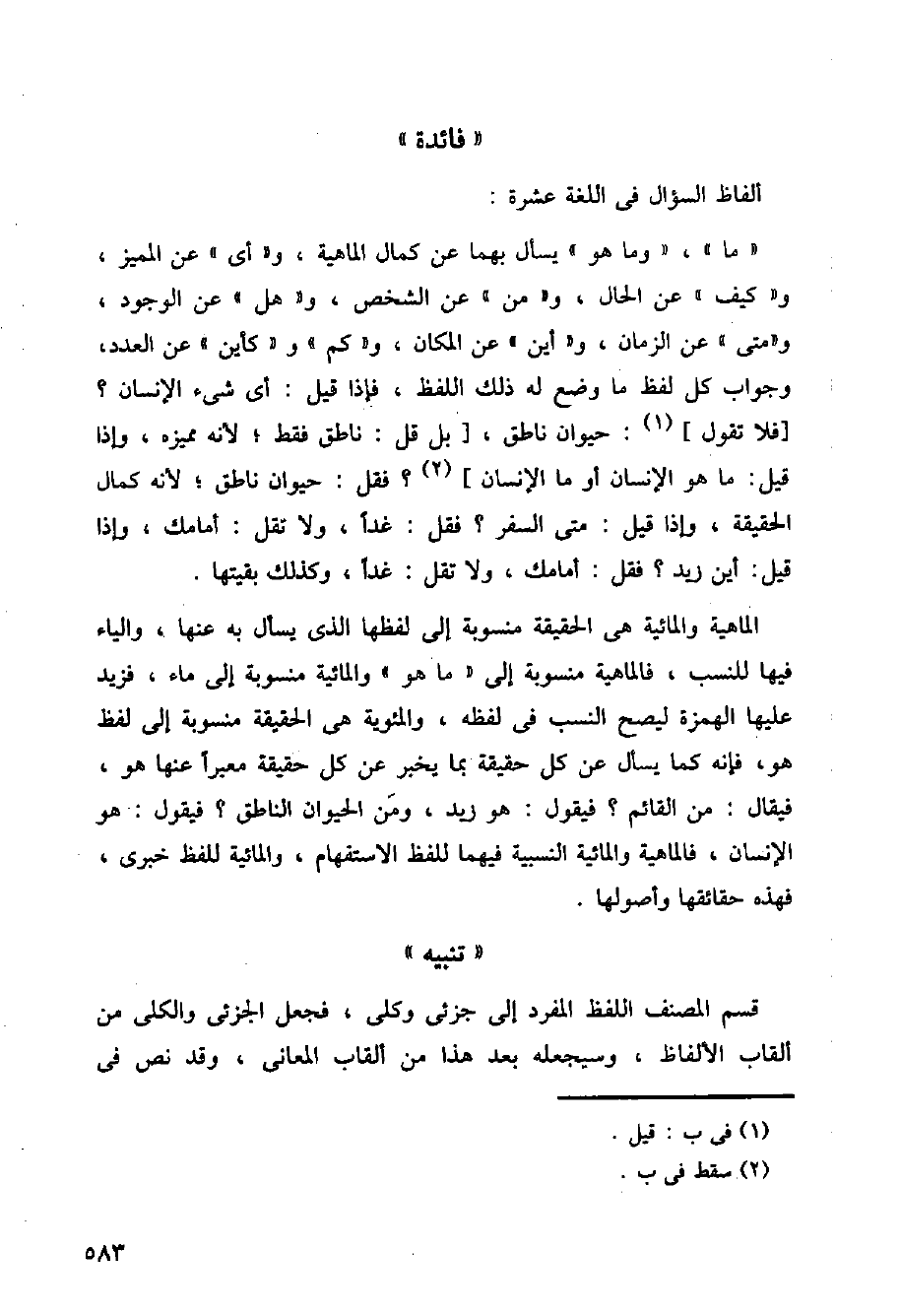 الماهية والمائية هي الحقيقة منسوبة إلى لفظها الذي يسأل به عنها، والياء فيها للنسب، فالماهية منسوبة إلى (ما هو) والمائية منسوبة إلى ماء، فزيد عليها الهمزة ليصح النسب في لفظه، والمئوية هي الحقيقة منسوبة إلى لفظ هو، فانه كما يسأل عن كل حقيقة بما يخبر عن كل حقيقة معبرا عنها هو، فيقال: من القائم؟ فيقول: هو زيد، ومن الحيوان الناطق؟ فيقول: هو الإنسان، فالماهية والمائية النسبية فيهما للفظ الاستفهام، والمائية للفظ خبري، فهذه حقائقها وأصولها.