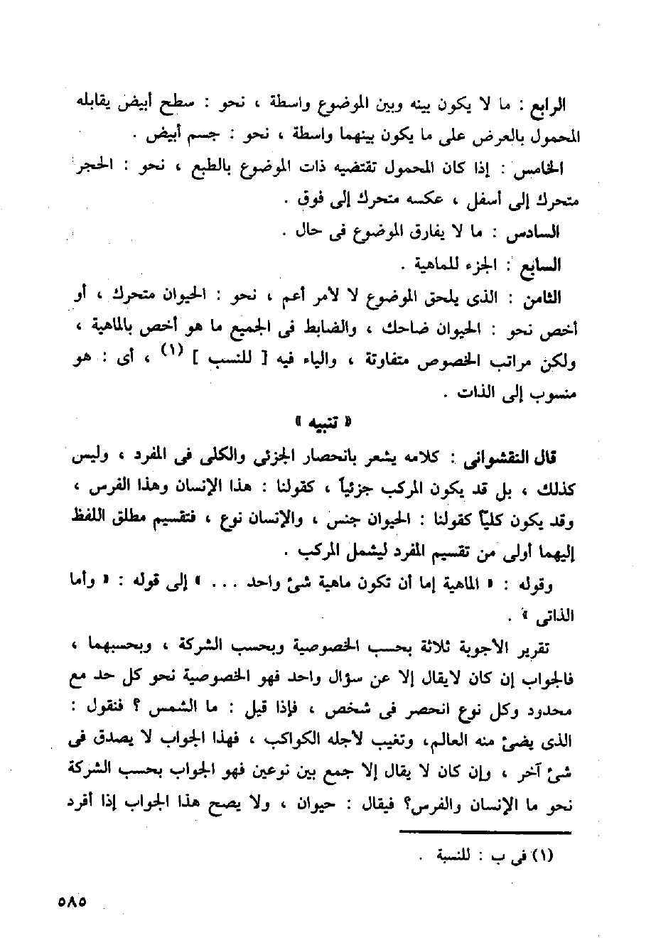 وقوله: (الماهية إما أن تكون ماهية شيء واحد ...) إلى قوله: (وأما الذاتي).