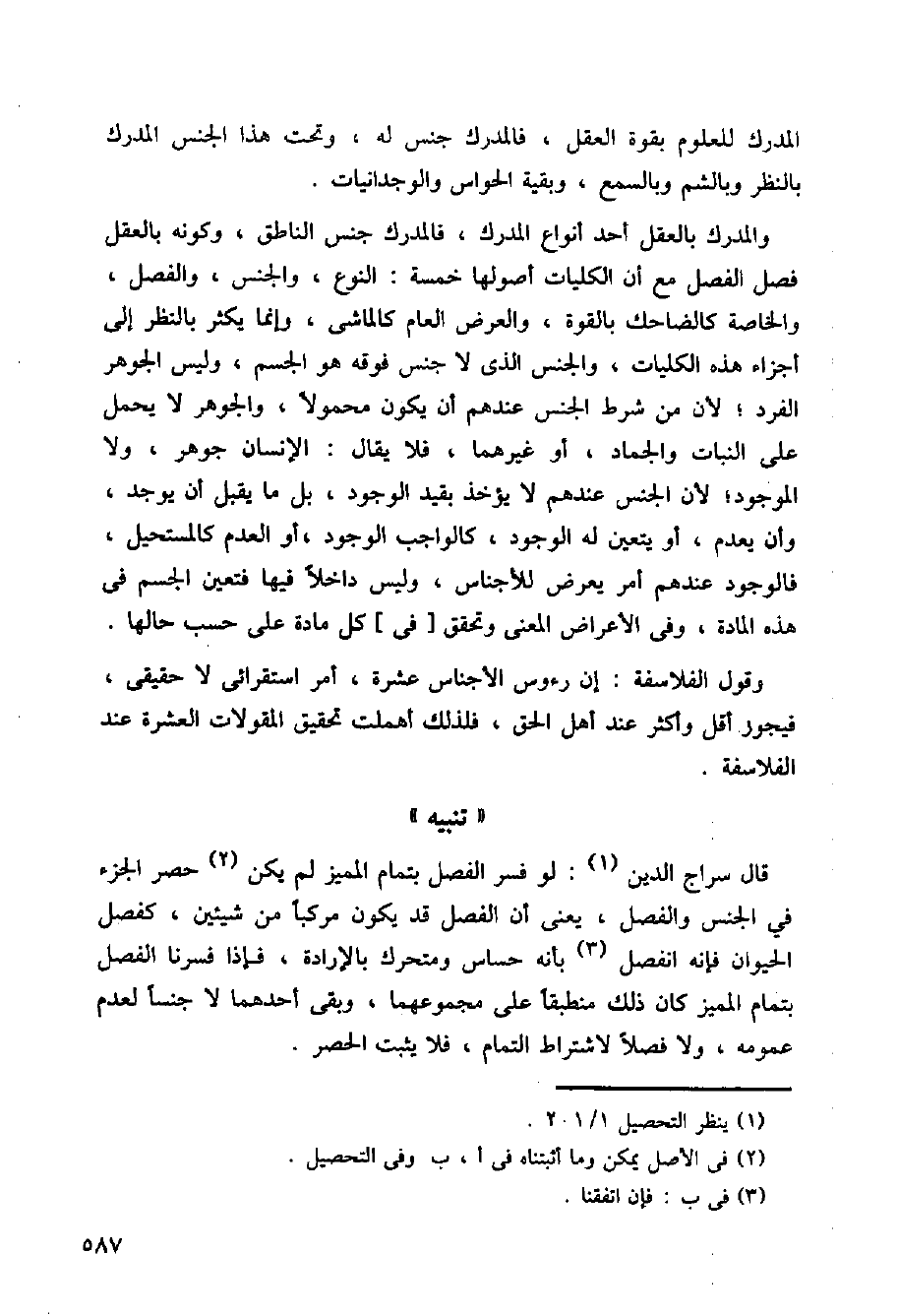 والمدرك بالعقل أحد أنواع المدرك، فالمدرك جنس الناطق، وكونه بالعقل فصل الفصل مع أن الكليات أصولها خمسة: النوع، والجنس، والفصل، والخاصة كالضاحك بالقوة، والعرض العام كالماشي، وإنما يكثر بالنظر إلى أجزاء هذه الكليات، والجنس الذي لا جنس فوقه هو الجسم، وليس الجوهر الفرد؛ لأن من ِشرط الجنس عندهم أن يكون محمولا، والجوهر لا يحمل على النبات والجماد، أو غيرهما، فلا يقال: الإنسان جوهر، ولا الموجود؛ لأن الجنس عندهم لا يؤخذ بقيد الوجود، بل ما يقبل أن يوجد، وأن يعدم، أو يتعين أنه الوجود، كالواجب الوجود، أو العدم كالمستحيل، فالوجود عندهم أمر يعرض للأجناس، وليس داخلا فيها فتعين الجسم في هذه المادة، وفى الأعراض المعنى وتحقق] في [كل مادة على حسب حالها.