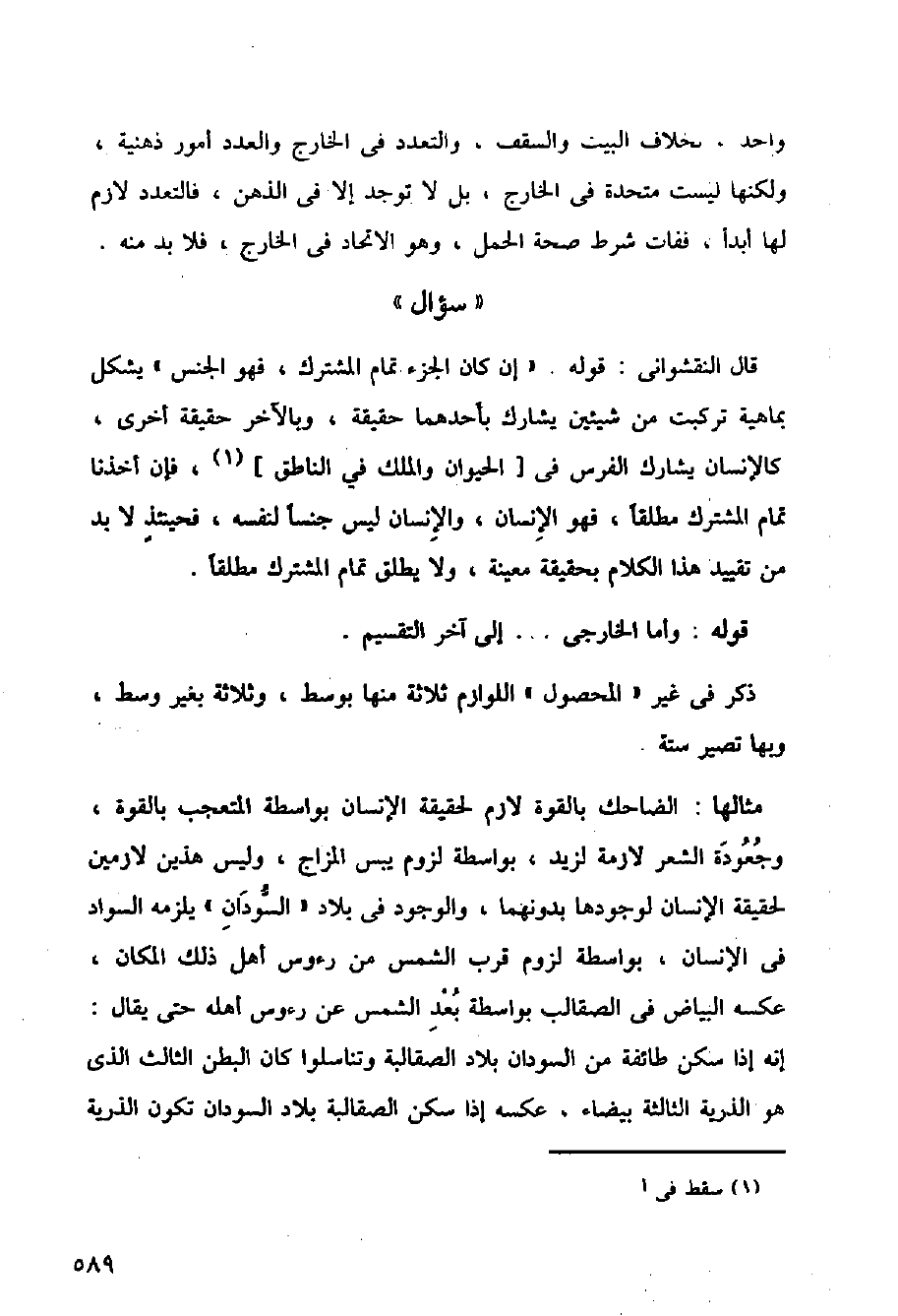 قال النقشواني: قوله. (إن كان الجزء تمام المشترك، فهو الجنس) يشكل بماهية تركبت من شيئين يشارك بأحدهما حقيقة، وبالآخر حقيقة أخرى، كالإنسان يشارك الفرس في] الحيوان والملك في الناطق [، فإن أخذنا تمام المشترك مطلقا، فهو الإنسان، والإنسان ليس جنسا لنفسه، فحينئذ لابد من تقييد هذا الكلام بحقيقة معينة، ولا يطلق تمام المشترك مطلقا.