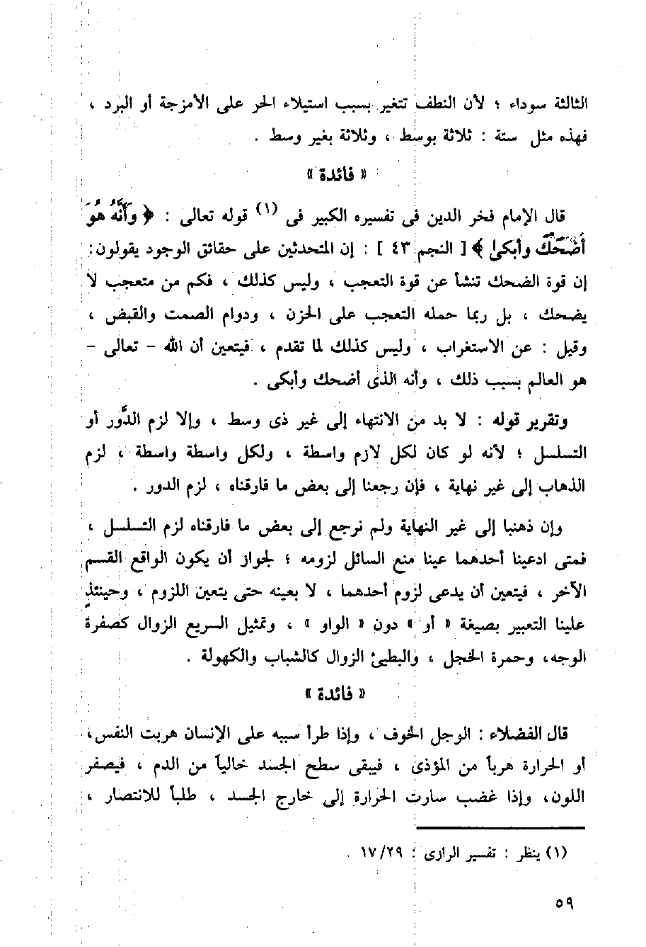 قال الإمام فخر الدين في تفسيره الكبير في قوله تعالى: {وأنه هو أضحك وأبكى} [النجم 43]: إن المتحدثين على حقائق الوجود يقولون: إن قوة الضحك تنشا عن قوة التعجب، وليس كذلك، فكم من متعجب لا يضحك، بل ربما حمله التعجب على الحزن، ودوام الصمت والقبض، وقيل: عن الاستغراب، وليس كذلك لما تقدم، فيتعين أن الله -تعالى- هو العالم بسبب ذلك، وأنه الذي أضحك وأبكى.