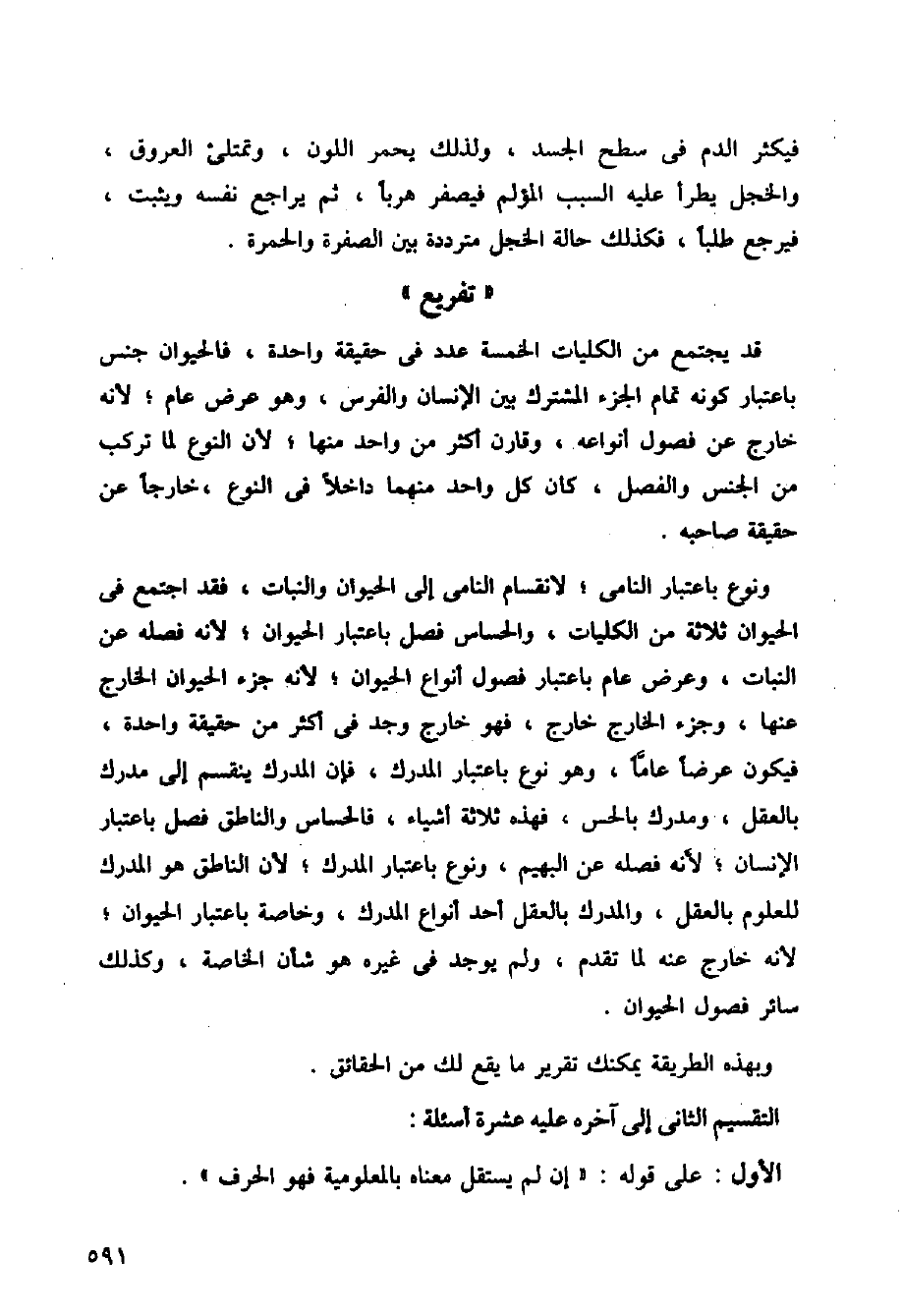 ونوع باعتبار النامي؛ لانقسام النامي إلى الحيوان والنبات، فقد اجتمع في الحيوان ثلاثة من الكليات، والحساس فصل باعتبار الحيوان؛ لأنه فصله عن النبات، وعرض عام باعتبار فصول أنواع الحيوان؛ لأنه جزء الحيوان الخارج عنها، وجزء الخارج خارج، فهو خارج وجد في أكثر من حقيقة واحدة، فيكون عرضا عاما، وهو نوع باعتبار المدرك، فإن المدرك ينقسم إلى مدرك بالعقل، ومدرك بالحس، فهذه ثلاثة أشياء، فالحساس والناطق فصل باعتبار الإنسان؛ لأنه فصله عن البهيم، ونوع باعتبار المدرك؛ لأن الناطق هو المدرك للعلوم بالعقل، والمدرك بالعقل أحد أنواع المدرك، وخاصة باعتبار الحيوان؛ لأنه خارج عنه لما تقدم، ولم يوجد في غيره هو شأن الخاصة، وكذلك سائر فصول الحيوان.