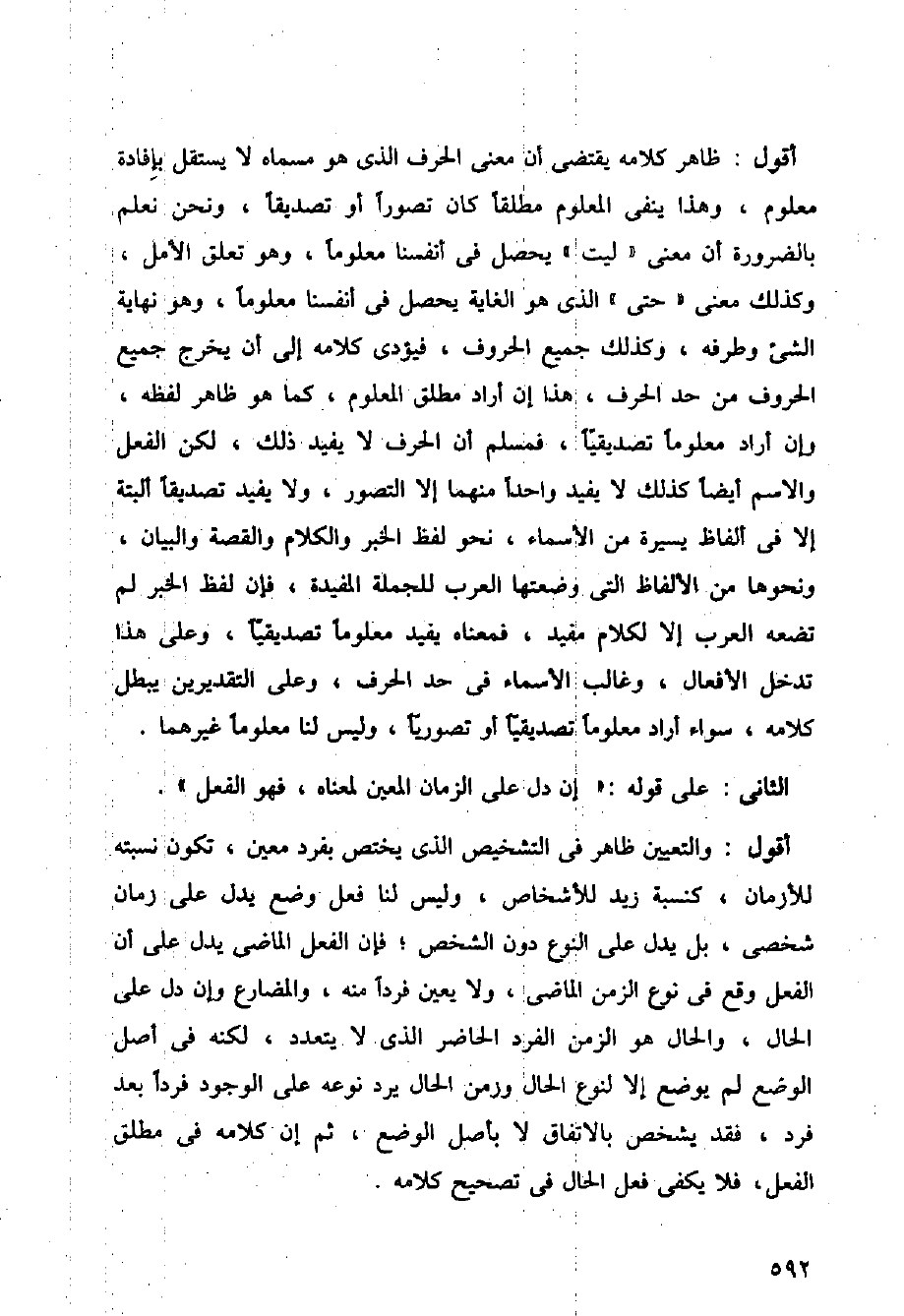 أقول: والتعيين ظاهر في التشخيص الذي يختص بفرد معين، تكون نسبته للأزمان، كنسبة زيد للأشخاص، وليس لنا فعل وضع يدل على زمان شخصي، بل يدل على النوع دون الشخص؛ فإذن الفعل الماضي يدل على أن الفعل وقع في نوع الزمن الماضي، ولا يعين فردا منه، والمضارع وإن دل على الحال، والحال هو الزمن الفرد الحاضر الذي لا يتعدد، لكنه في أصل الوضع لم يوضع إلا لنوع الحال وزمن الحال يرد نوعه على الوجود فردا بعد فرد، فقد يشخص بالاتفاق لا بأصل الوضع، ثم إن كلامه في مطلق الفعل، فلا يكفي فعل الحال في تصحيح كلامه.
