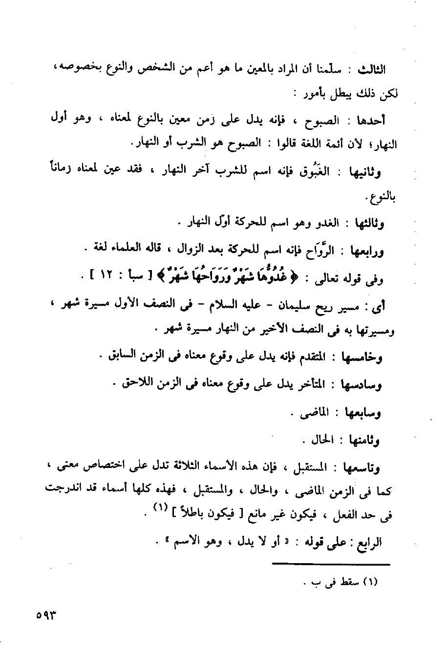 أحدها: الصبوح، فإنه يدل على زمن معين بالنوع لمعناه، وهو أول النهار؛ لأن أئمة اللغة قالوا: الصبوح هو الشرب أو النهار.