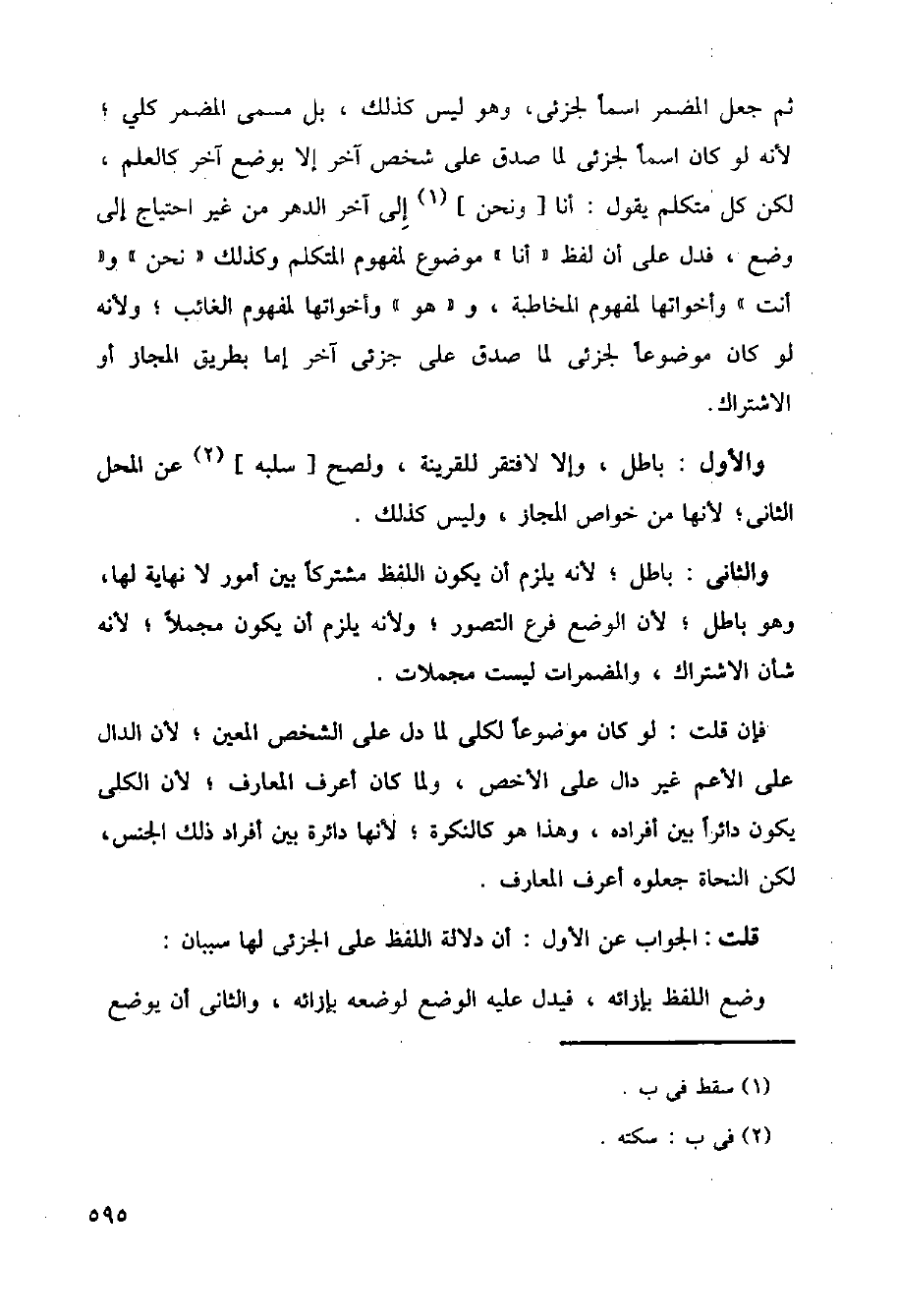 والثاني: باطل؛ لأنه يلزم أن يكون اللفظ مشترك بين أمور لا نهاية لها، وهو باطل؛ لأن الوضع فرع التصور؛ ولأنه يلزم أن يكون مجملا؛ لأنه شأن الاشتراك، والمضمرات ليست مجملات.