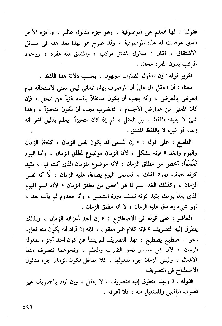 فقولنا: لها العلم هي الموصوفية، وهو جزء مدلول عالم، والجزء الآخر الذي عرضت له هذه الموصوفية، وقد صرح هو بهذا بعد هذا في مسائل الاشتقاق، فقال: مدلول المشتق مركب، والمشتق منه مفرد، ووجود المركب بدون المفرد محال.