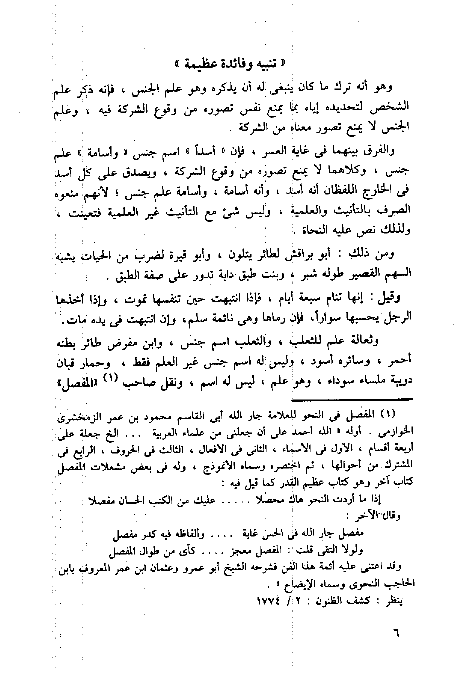وثعالة علم للثعلب، والثعلب اسم جنس، وابن مفرض طائر بطنه أحمر، وسائره اسود، وليس له اسم جنس غير العلم فقط، وحمار قبان دويبة ملساء سوداه، وهو علم، ليس له اسم، ونقل صاحب (المفصل)