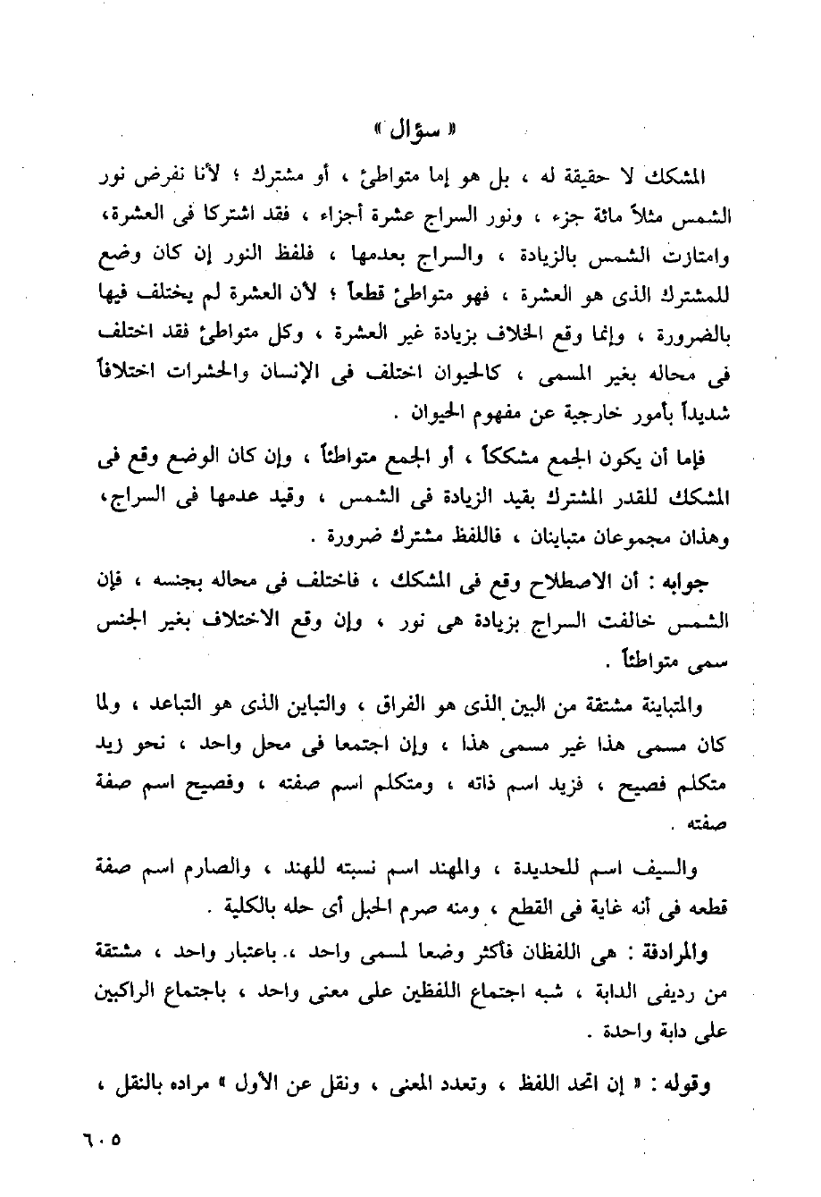 فإما أن يكون الجمع مشككا، أو الجمع متواطئا، وإن كان الوضع وقع في المشكك للقدر المشترك بقيد الزيادة في الشمس، وقيد عدمها في السراج، وهذان مجموعان متباينان، فاللفظ مشترك ضرورة.