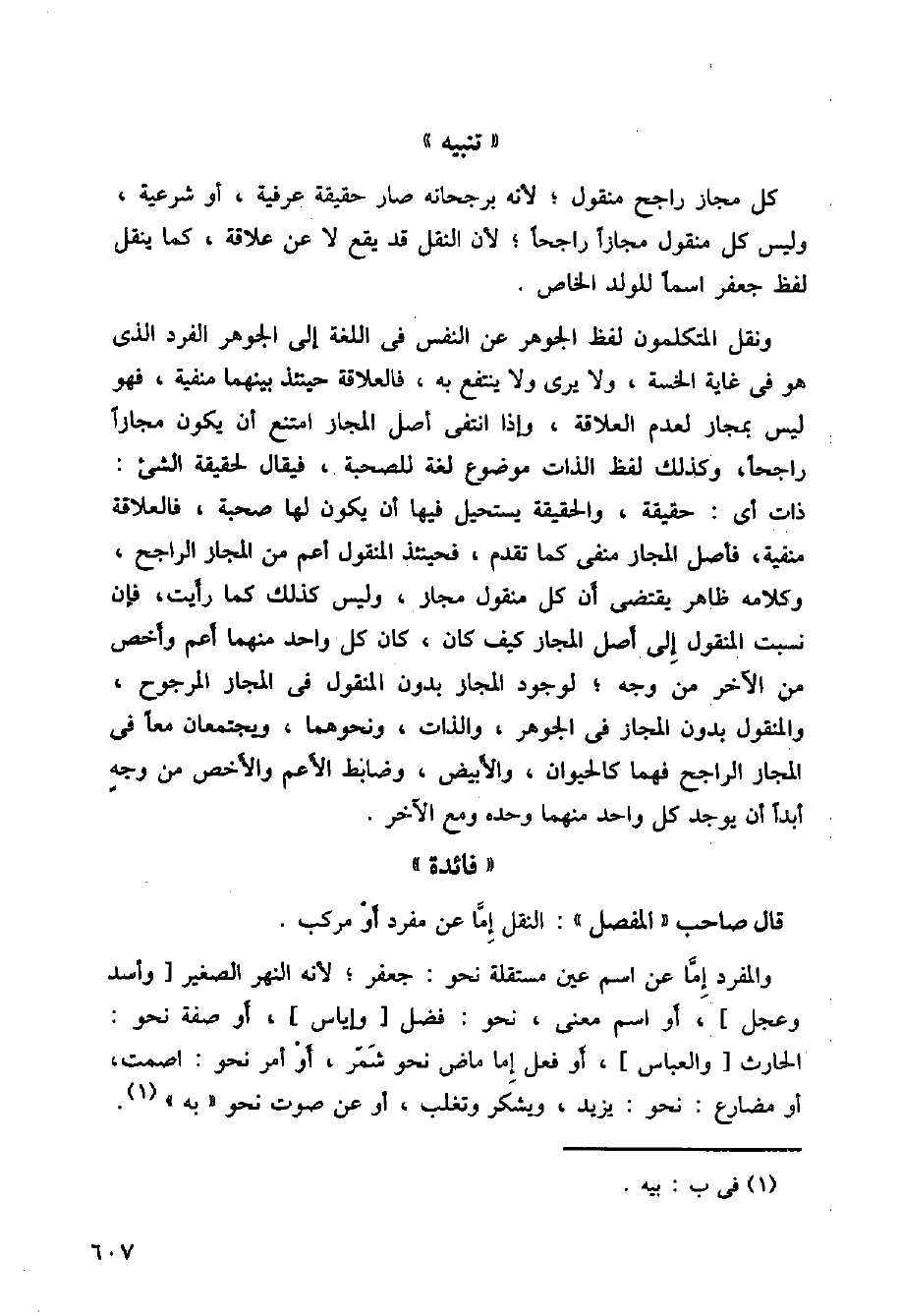 ونقل المتكلمون لفظ الجوهر عن النفس في اللغة إلى الجوهر الفرد الذي هو في غاية الخسة، ولا يرى ولا ينتفع به، فالعلاقة حينئذ بينهما منفية، فهو ليس بمجار لعدم العلاقة، وإذا انتفى أصل المجاز امتنع أن يكون مجازا راجحا، وكذلك لفظ الذات موضوع لغة للصحبة، فيقال لحقيقة الشيء: ذات أي: حقيقة، والحقيقة يستحيل فيها أن يكون لها صحبة، فالعلاقة منفية، فأصل المجاز منفي كما تقدم، فحينئذ المنقول أعم من المجاز الراجح، وكلامه ظاهر يقتضى أن كل منقول مجاز، وليس كذلك كما رأيت، فإن نسبت المنقول إلى أصل المجاز كيف كان، كان كل واحد منهما أعم وأخص من الآخر من وجه؛ لوجود المجاز بدون المنقول في المجاز المرجوح، والمنقول بدون المجاز في الجوهر، والذات، ونحوهما، ويجتمعان معا في المجاز الراجح فهما كالحيوان، والأبيض، وضابط الأعم والأخص من وجه أبدا أن يوجد كل واحد منهما وحده ومع الآخر.