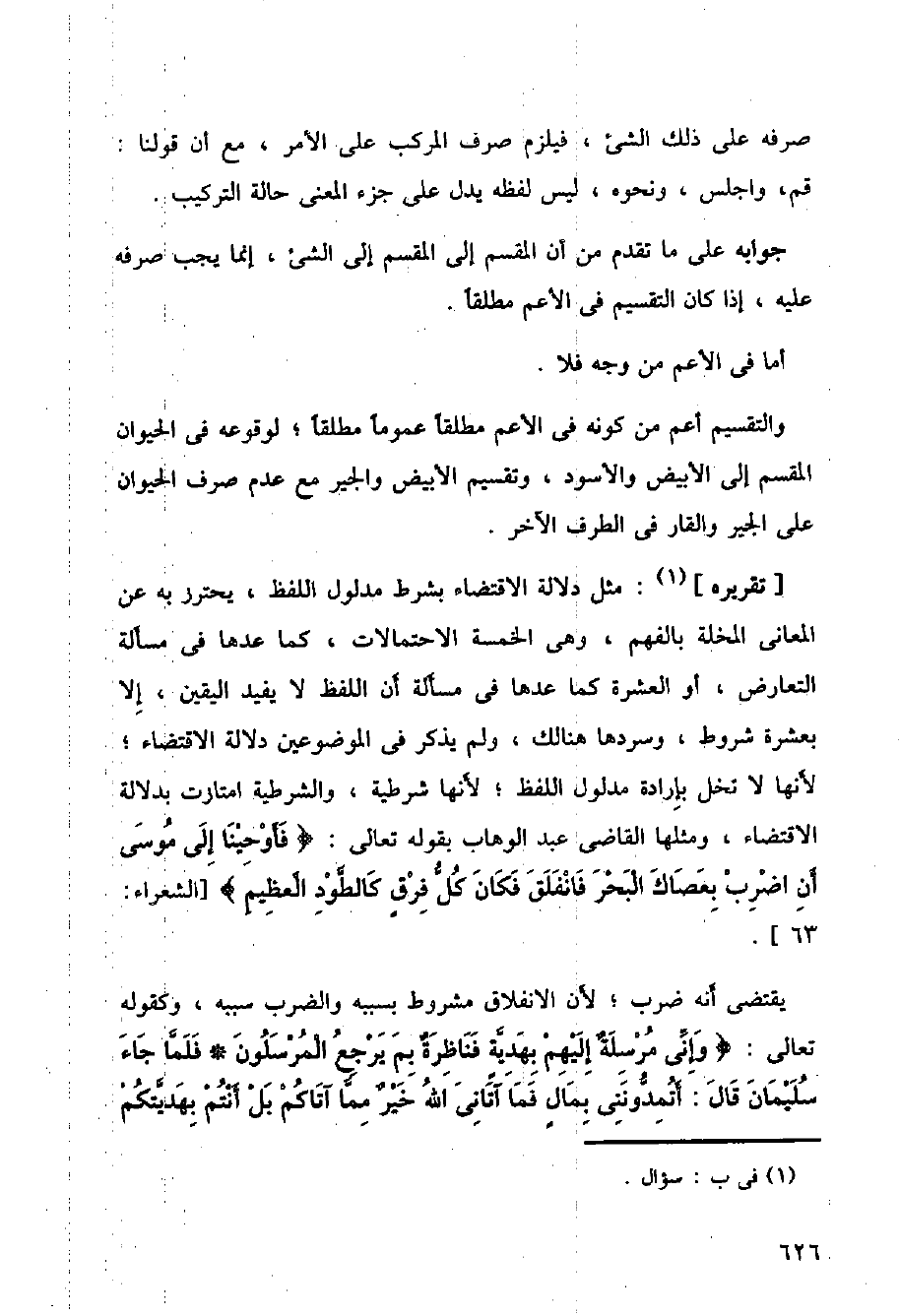 (تقريره): مثل دلالة الاقتضاء بشرط مدلول اللفظ، يحترز به عن المعاني المخلة بالفهم، وهي الخمسة الاحتمالات، كما عدها في مسألة التعارض، أو العشرة كما عدها في مسألة أن اللفظ لا يفيد اليقين إلا بعشرة شروط، وسردها هنالك، ولم يذكر في الموضوعين دلالة الاقتضاء؛ لأنها لا تخل بإرادة مدلول اللفظ؛ لأنها شرطية، والشرطية امتازت بدلالة الاقتضاء، ومثلها القاضي عبد الوهاب بقوله تعالى:} فأوحينا إلى موسى أن اضرب بعصاك البحر فانفلق فكان كل فرق كالطود العظيم {] الشعراء: 63 [.