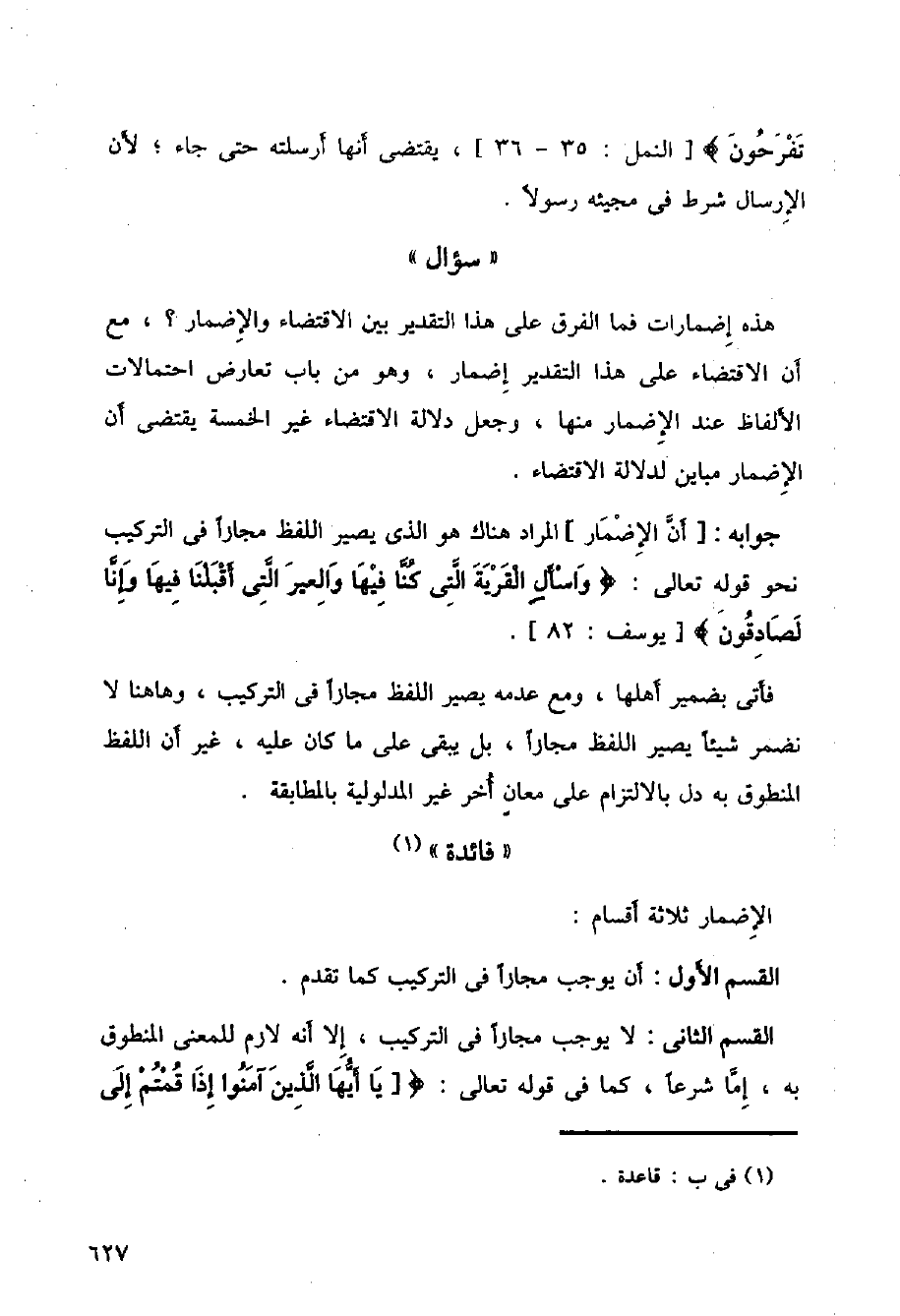 جوابه:] أن الإضمار [المراد هناك هو الذي يصير اللفظ مجازا في التركيب نحو قوله تعالى} واسأل القرية التي كنا فيها والعير التي أقبلنا فيها وإنا لصادقون {] يوسف: 82 [.