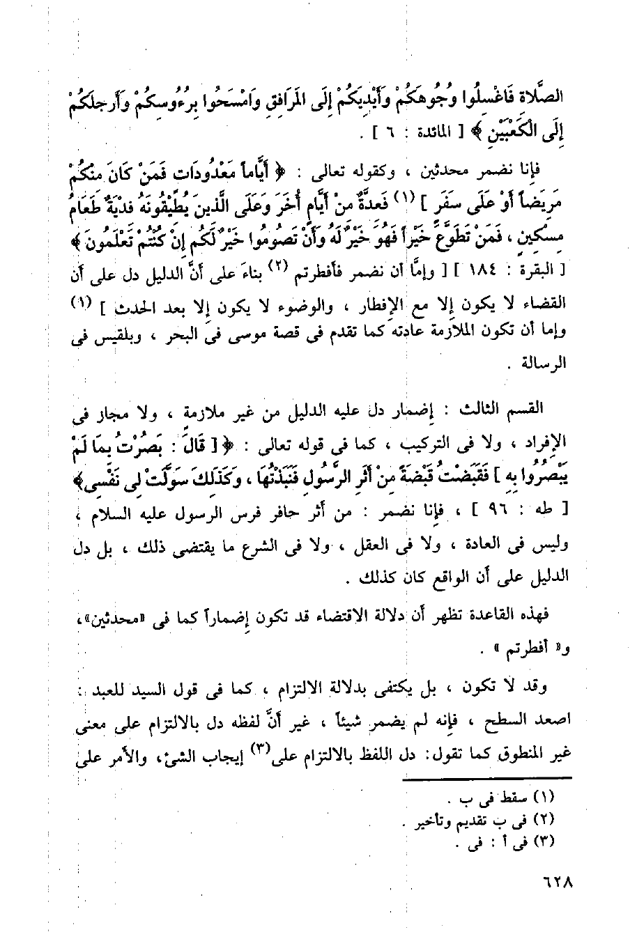 فإنا نضمر محدثين، وكقوله تعالى:} أياما معدودات فمن كان منكم مريضا أو على سفر [فعدةٌ من أيام أخر وعلى الذين يطيقونه فدية طعام مسكين، فمن تطوع خيرا فهو خيرٌ له وأن تصوموا خيرٌ لكم إن كنتم تعلمون {] البقرة: 184 [] وإما أن نضمر فأفطرتم بناء على أن الدليل دل على أن القضاء لا يكون إلا مع الإفطار، والوضوء لا يكون إلا بعد الحدث [وإما أن تكون الملازمة عادته كما تقدم في قصة موسى في البحر، وبلقيس في الرسالة.