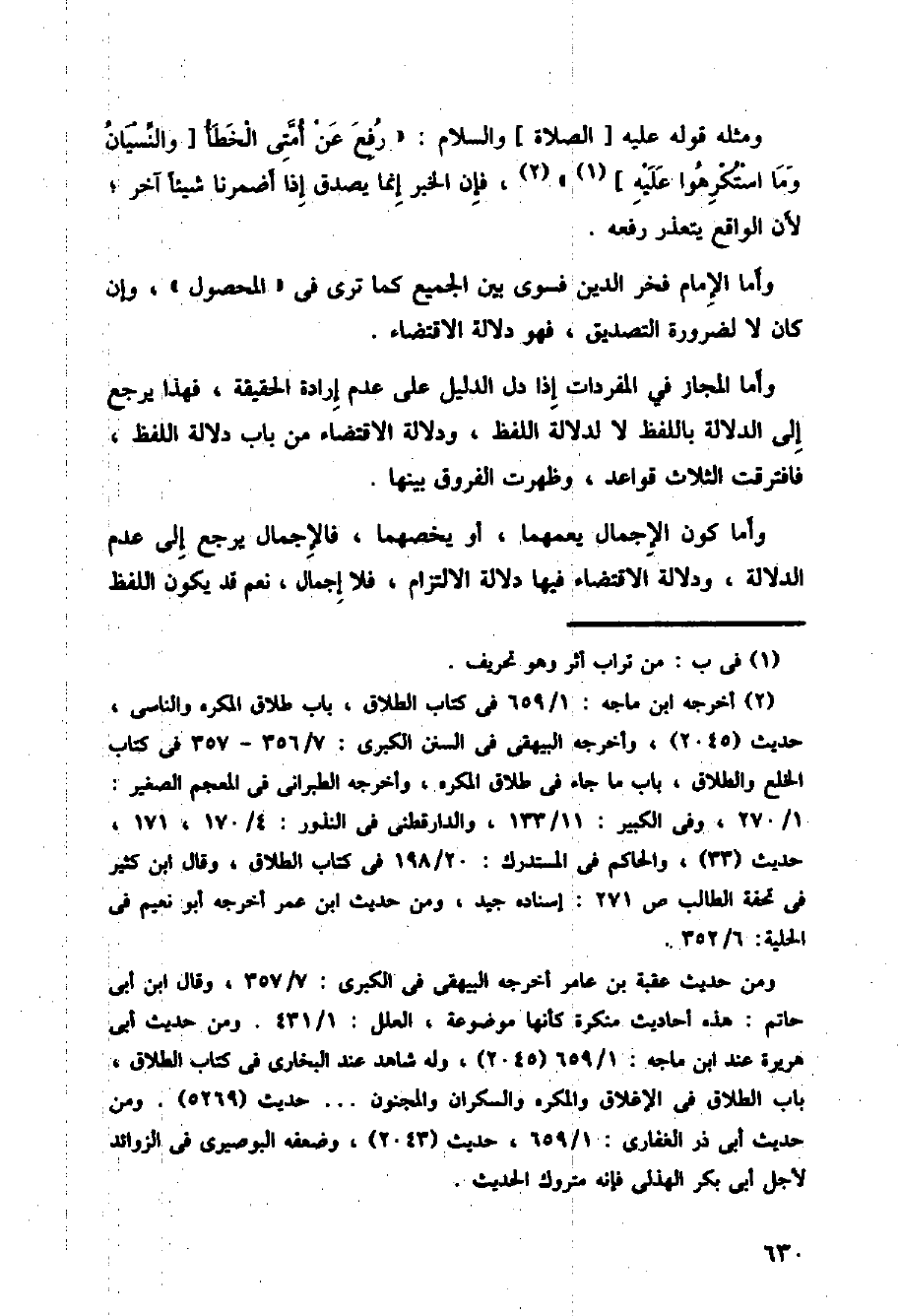 ومثله قوله عليه] الصلاة [والسلام: (رفع عن أمتي الخطأ] والنسيان وما استكرهوا عليه [)، فإن الخبر إنما يصدق إذا أضمرنا شيئا آخر؛ لأن الواقع يتعذر رفعه.