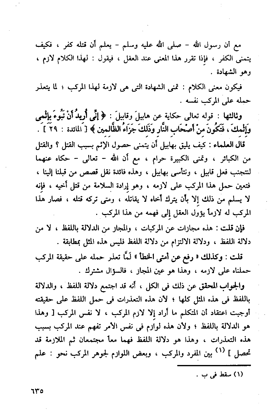 قال العلماء: كيف يليق بهابيل أن يتمنى حصول الإثم بسبب القتل؟ والقتل من الكبائر، وتمني الكبيرة حرام، مع أن الله -تعالى- حكاه عنهما لنتجنب فعل قابيل، ونتأسى بهابيل، وهذه فائدة نقل قصص من قبلنا إلينا، فتعين حمل هذا المركب على لازمه، وهو إرادة السلامة من قتل أخيه، فإنه لا يسلم من ذلك إلا لأن يترك أخاه لا يقاتله، ومتى تركه قتله، فصار هذا المركب له لازما يؤول العقل إلى فهمه من هذا المركب.