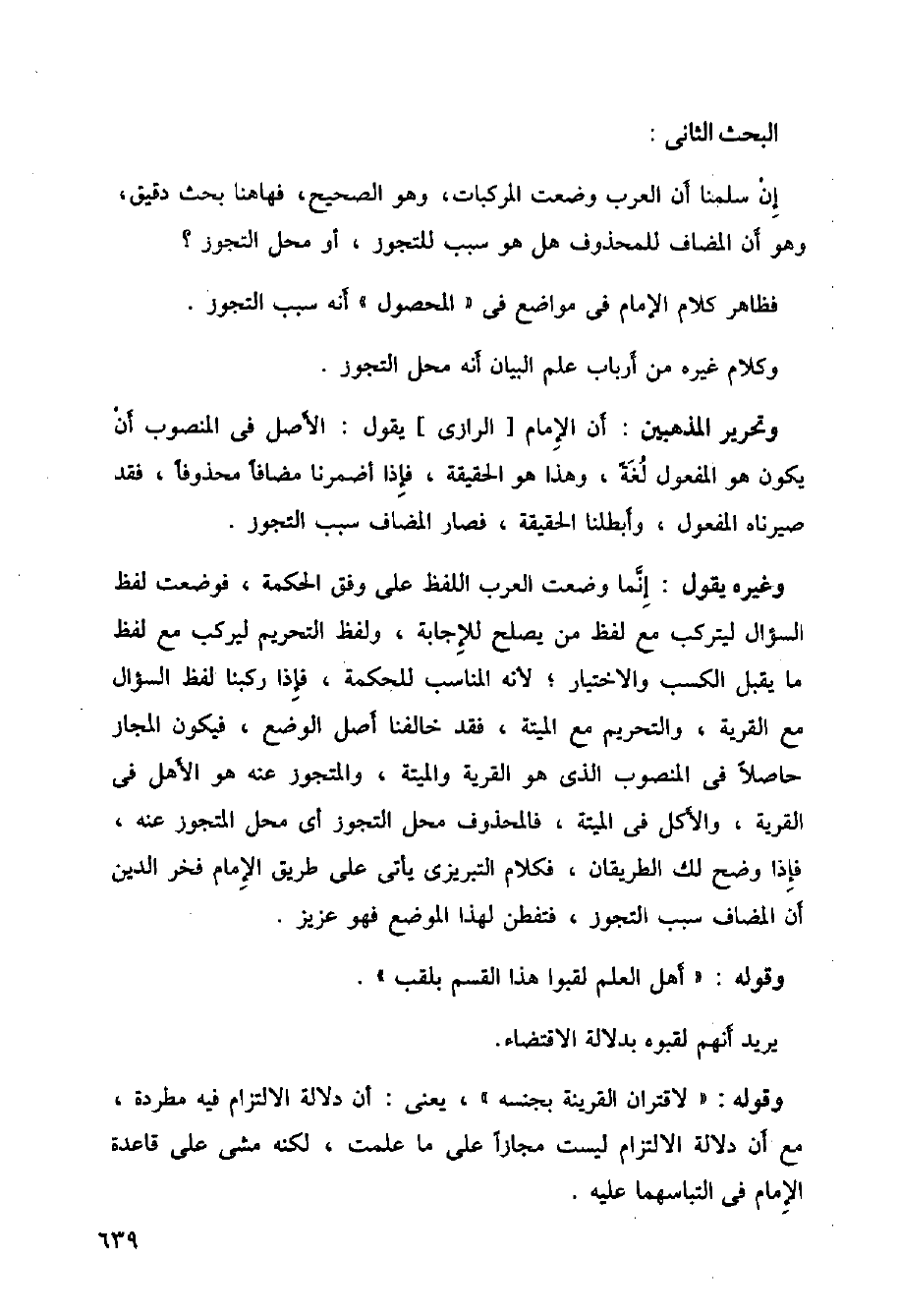 وتحرير المذهبين: أن الإمام [الرازي] يقول: الأصل في المنصوب أن يكون هو المفعول لغة، وهذا هو الحقيقة، فإذا أضمرنا مضافا محذوفا، فقد صيرناه المفعول، وأبطلنا الحقيقة، فصار المضاف سبب التجوز.