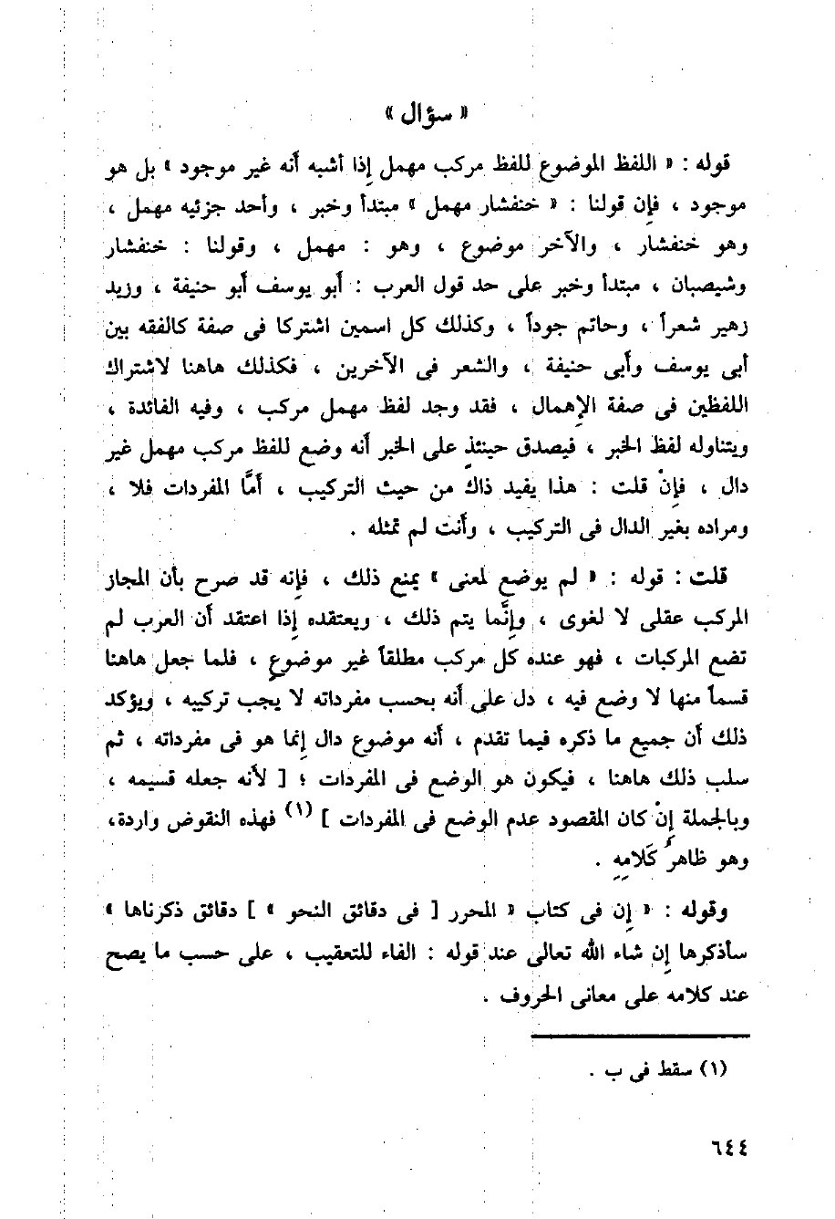 قوله: (اللفظ الموضوع للفظ مركب مهمل إذا أشبه أنه غير موجود) بل هو موجود، فإن قولنا: (خنفشار مهمل) مبتدأ وخبر، وأحد جزئيه مهمل، وهو خنفشار، والآخر موضوع، وهو: مهمل، وقولنا: خنفشار وشيصبان، مبتدأ وخبر على حد قول العرب: أبو يوسف أبو حنيفة، وزيد زهير شعرا، وحاتم جودا، وكذلك كل اسمين اشتركا في صفة كالفقه بين أبي يوسف وأبي حنيفة، والشعر في الآخرين، فكذلك هاهنا لاشتراك اللفظين في صفة الإهمال، فقد وجد لفظ مهمل مركب، وفيه الفائدة، ويتناوله لفظ الخبر، فيصدق حينئذ على الخبر أنه وضع للفظ مركب مهمل غير دال، فإن قلت: هذا يفيد ذاك من حيث التركيب، أما المفردات فلا، ومراده بغير الدال في التركيب، وأنت لم تمثله.