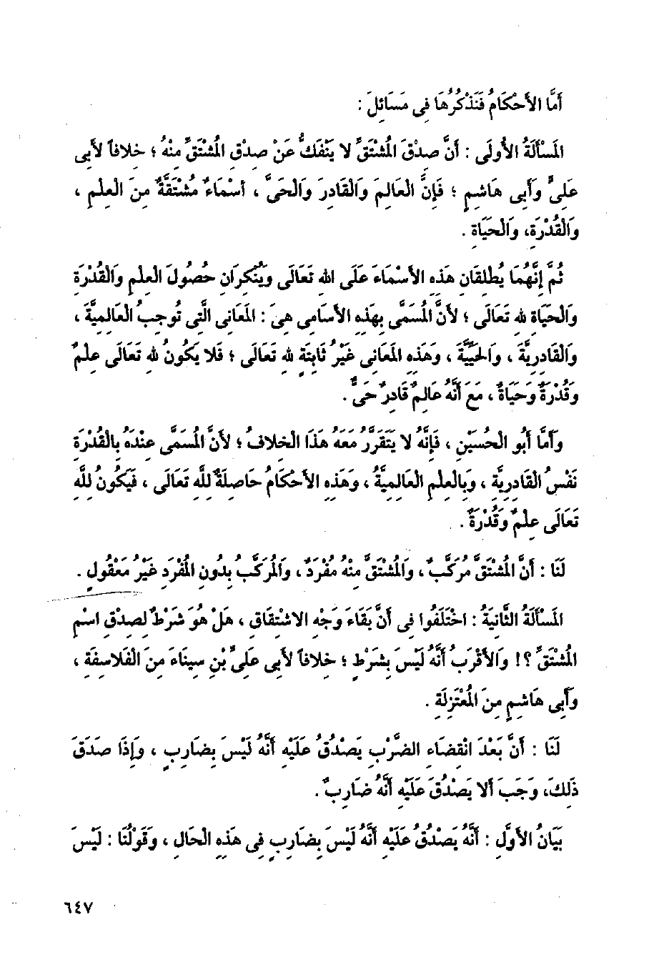 المسألة الأولى: أن صدق المشتق لا ينفك عن صدق المشتق منه؛ خلافا لأبي على وأبي هاشم؛ فإن العالم والقادر والحي، أسماء مشتقة مع العلم، والقدرة، والحياة.