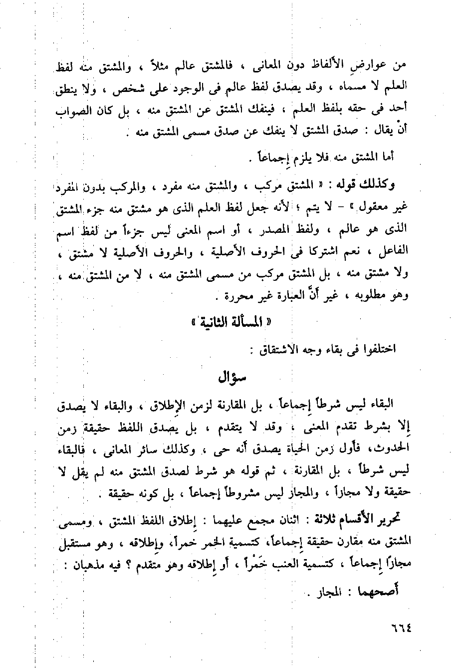 وكذلك قوله: (المشتق مركب، والمشتق منه مفرد، والمركب بدون المفرد غير معقول) - لا يتم؛ لأنه جعل لفظ العلم الذي هو مشتق منه جزء المشتق الذي هو عالم، ولفظ المصدر، أو اسم المعنى ليس جزءا من لفظ اسم الفاعل، نعم اشتراكا في الحروف الأصلية، والحروف الأصلية لا مشتق، ولا مشتق منه، بل المشتق مركب من مسمى المشتق منه، لا من المشتق منه، وهو مطلوبة، غير أن العبارة غير محررة.