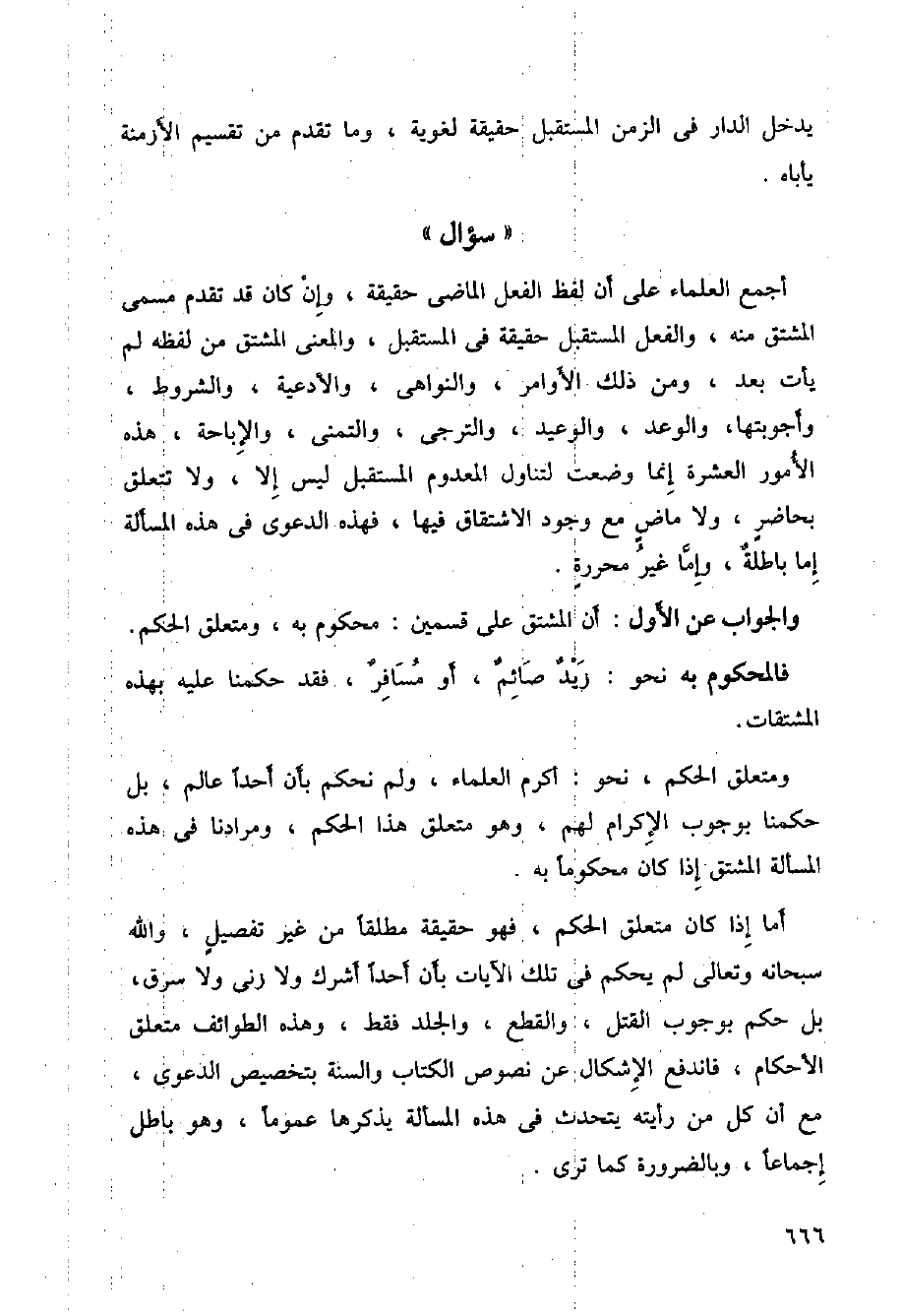 أجمع العلماء على أن لفظ الفعل الماضي حقيقة، وإن كان قد تقدم مسمى المشتق منه، والفعل المستقبل حقيقة في المستقبل، والمعنى المشتق من لفظه لم يأت بعد، ومن ذلك الأوامر، والنواهي، والأدعية، والشروط، وأجوبتها، والوعد، والوعيد، والترجي، والتمني، والإباحة، هذه الأمور العشرة إنما وضعت لتناول المعدوم المستقبل ليس إلا، ولا تتعلق بحاضر، ولا ماض مع وجود الاشتقاق فيها، فهذه الدعوى في هذه المسألة إما باطلة، وإما غير محررة.