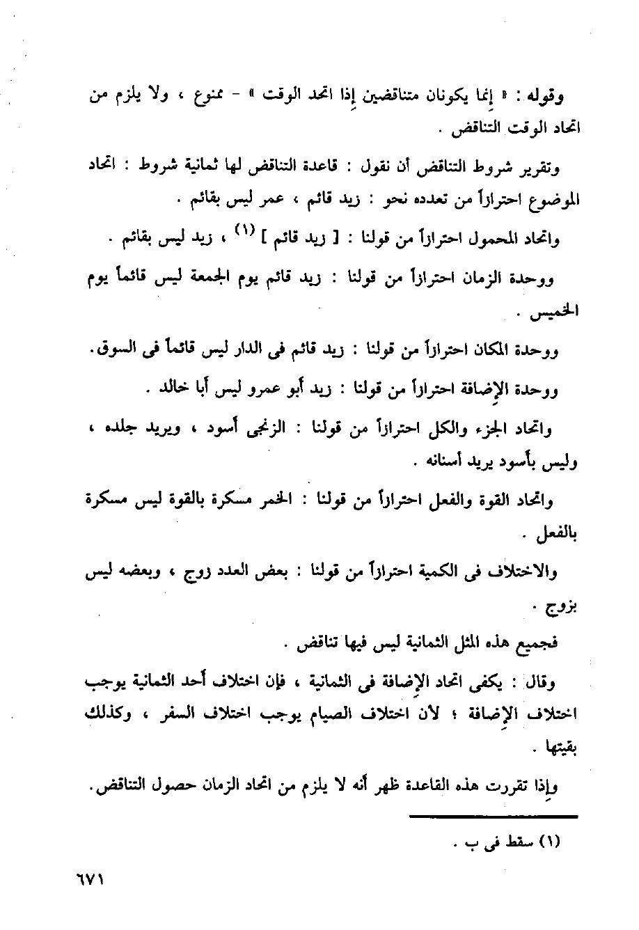 وتقرير شروط التناقض أن نقول: قاعدة التناقض لها ثمانية شروط: اتحاد الموضوع احترازا من تعدده نحو: زيد قائم، عمر ليس بقائم.