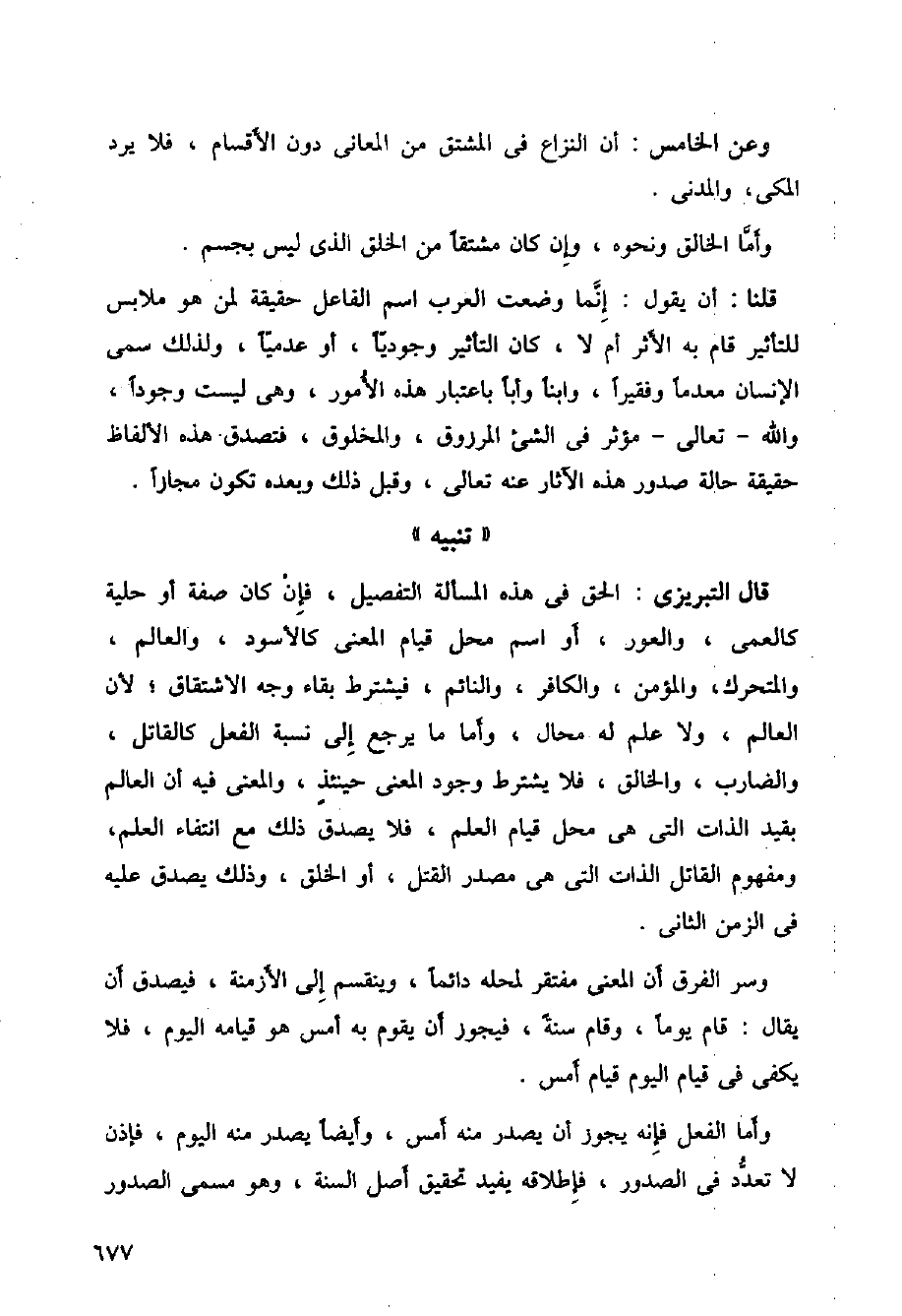 قال التبريزي: الحق في هذه المسألة التفصيل، فإن كان صفة أو حلية كالعمى، والعور، أو اسم محل قيام المعنى كالأسود، والعالم، والمتحرك، والمؤمن، والكافر، والنائم، فيشترط بقاء وجه الاشتقاق؛ لأن العالم، ولا علم له محال، وأما ما يرجع إلى نسبة الفعل كالقاتل، والضارب، والخالق، فلا يشترط وجود المعنى حينئذ، والمعنى فيه أن العالم بقيد الذات التي هي محال قيام العلم، فلا يصدق ذلك مع انتفاء العلم، ومفهوم القاتل الذات التي هي مصدر القتل، أو الخلق، وذلك يصدق عليه في الزمن الثاني.