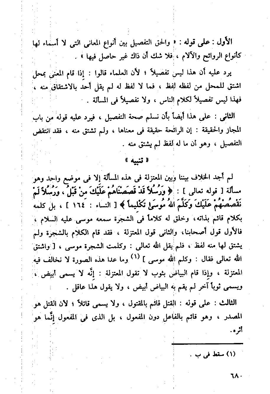 لم أجد الخلاف بيننا وبين المعتزلة في هذه المسألة إلا في موضع واحد وهو مسألة [قوله تعالى]: {ورسلا قد قصصناهم عليك من قبل، ورسلا لم نقصصهم عليك وكلم الله موسى تكليما} [النساء:164]، بل كلمه بكلام قائم بذاته، وخلق له كلاما في الشجرة سمعه موسى عليه السلام، فالأول قول أصحابنا، والثاني قول المعتزلة، فقد قام الكلام بالشجرة ولم يشتق لها منه لفظ، فلم يقل الله تعالى: وكلمت الشجرة موسى، [واشتق الله تعالى فقال: وكلم الله موسى] وما عدا هذه الصورة لا نخالف فيه المعتزلة، وإذا قام البياض بثوب لا تقول المعتزلة: إنه لا يسمى أبيض، ويسمى ثوبا آخر لم يقم به البياض أبيض، ولا يقول هذا عاقل.