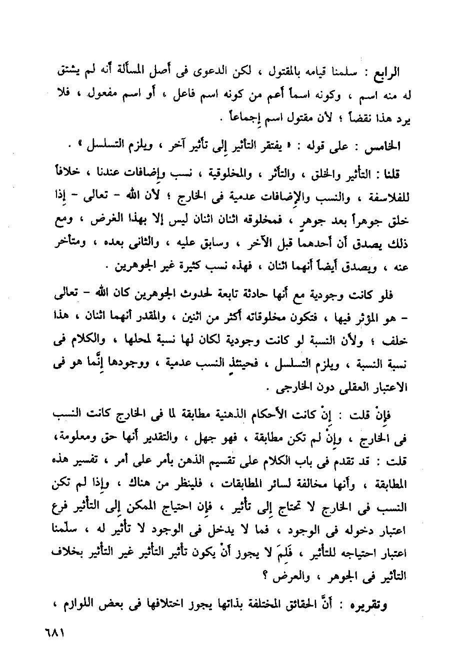 قلنا: التأثير والخلق، والتأثر، والمخلوقية، نسب وإضافات عندنا، خلافا للفلاسفة، والنسب والإضافات عدمية في الخارج؛ لأن الله-تعالى-إذا خلق جوهرا بعد جوهر، فمخلوقه اثنان اثنان ليس إلا بهذا الغرض، ومع ذلك يصدق أن أحدهما قبل الآخر، وسابق عليه، والثاني بعده، ومتأخر عنه، ويصدق أيضا أنهما اثنان، فهذه نسب كثيرة غير الجوهرين.