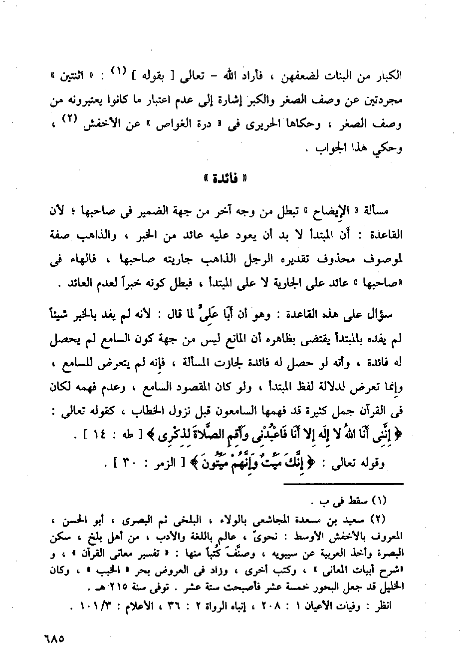ليس من جهة كون السامع لم يحصل له فائدة، وأنه لو حصل له فائدة لجازت المسألة، فإنه لم يتعرض للسامع، وإنما تعرض لدلالة لفظ المبتدأ، ولو كان المقصود السامع، وعدم فهمه لكان في القرآن جمل كثيرة قد فهمها السامعون قبل نزول الخطاب، كقوله تعالى: {إنني أنا لا إله إلا أنا فاعبدني وأقم الصلاة لذكري} [طه:14].