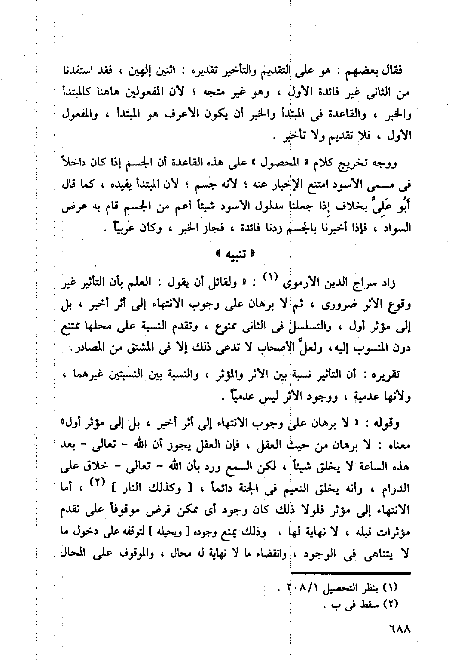 زاد سراج الدين الأرموي: (ولقائل أن يقول: العلم بأن التأثير غير وقوع الأثر ضروري، ثم لا برهان على وجوب الانتهاء إلى أثر أخير، بل إلى مؤثر أول، والتسلسل في الثاني ممنوع، وتقدم النسبة على محلها ممتنع دون المنسوب إليه، ولعل الأصحاب لا تدعى ذلك إلا في المشتق من المصادر).