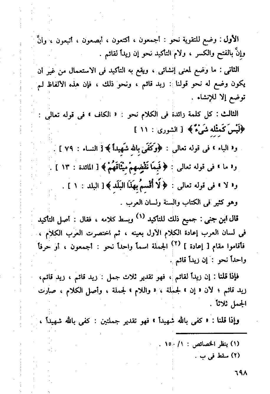 فإذا قلنا: إن زيدا لقائم، فهو تقدير ثلاث جمل: زيد قائم، زيد قائم، زيد قائم؛ لأن "إن" لجملة، "واللام" لجملة، وأصل الكلام، صارت الجمل ثلاثا.