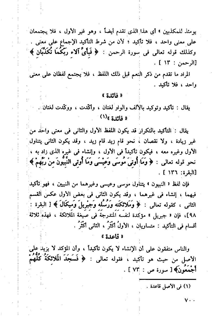 فإن لفظ "النبيون" يتناول موسى وعيسى وغيرهما من النبيين، فهو تأكيد فيهما، إنشاء في غيرهما، وقد يكون الثاني في بعض الأول عكس القسم الثاني، كقوله تعالى: (وملائكته ورسله وجبريل وميكال) [البقرة: 98]، فإن "جبريل" مؤكدة لنفسه المندرجة في صيغة الملائكة، فهذه ثلاثة أقسام في التأكيد: متساويان، الأول أكثر، الثاني أكثر.